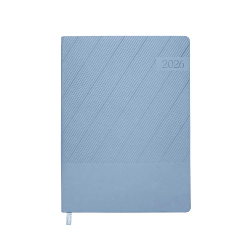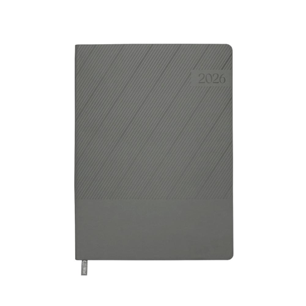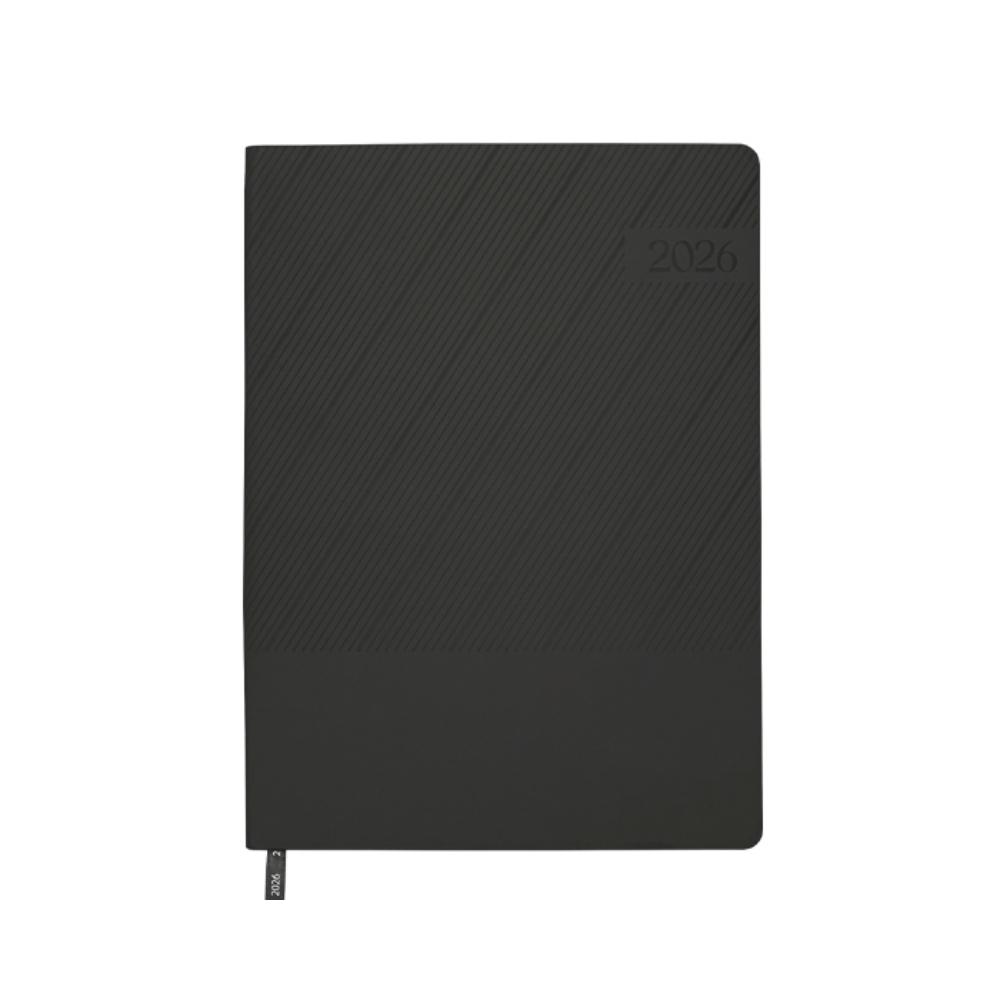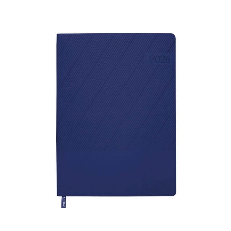 Agenda semanal de pasta semi flexible de PU, con textura de líneas diagonales en la parte superior y lisa en la parte inferior. Cuenta con 98 hojas (196 páginas). Contiene: cuadro de dedicatoria, hoja de datos personales, calendario 2026 y días festivos, calendarios 2025 a 2029, planificador anual de gastos, planificador de proyectos (5), planificador anual, planificadores mensuales (12), agenda semanal, directorio de contactos, teléfonos de interés, hojas para notas, Mapa Red Metro CDMX, Mapa Red Metrobús CDMX, Mapa Macrobús Guadalajara, Jalisco; Mapa Transmetro Monterrey, Nvo. León, Hoja de Stickers. Incluye: Listón separador de color, impreso con el año 2026. Presentación: caja de regalo a color.