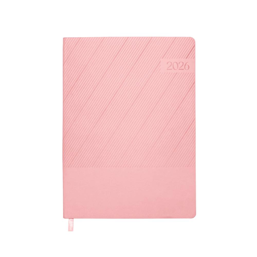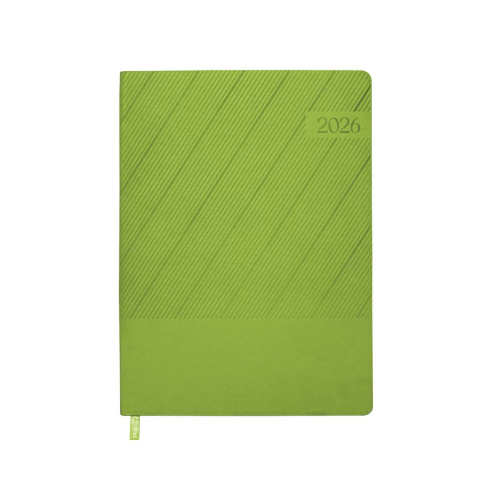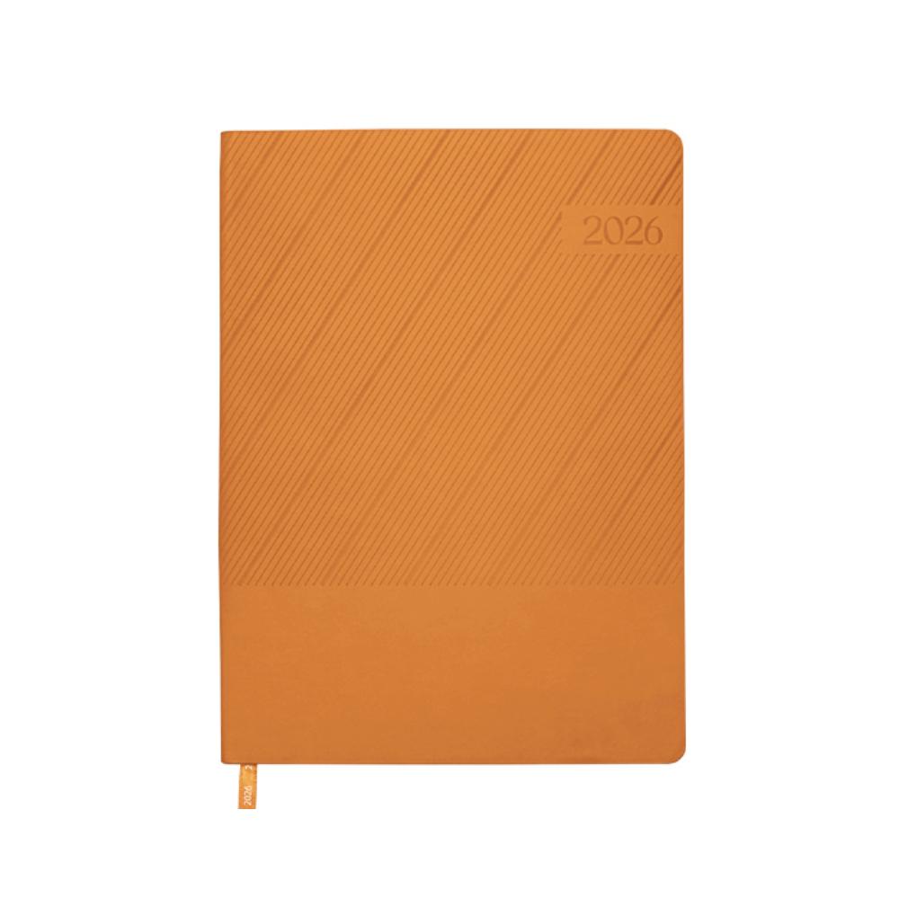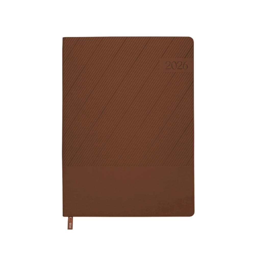 Agenda semanal de pasta semi flexible de PU, con textura de líneas diagonales en la parte superior y lisa en la parte inferior. Cuenta con 98 hojas (196 páginas). Contiene: cuadro de dedicatoria, hoja de datos personales, calendario 2026 y días festivos, calendarios 2025 a 2029, planificador anual de gastos, planificador de proyectos (5), planificador anual, planificadores mensuales (12), agenda semanal, directorio de contactos, teléfonos de interés, hojas para notas, Mapa Red Metro CDMX, Mapa Red Metrobús CDMX, Mapa Macrobús Guadalajara, Jalisco; Mapa Transmetro Monterrey, Nvo. León, Hoja de Stickers. Incluye: Listón separador de color, impreso con el año 2026. Presentación: caja de regalo a color.