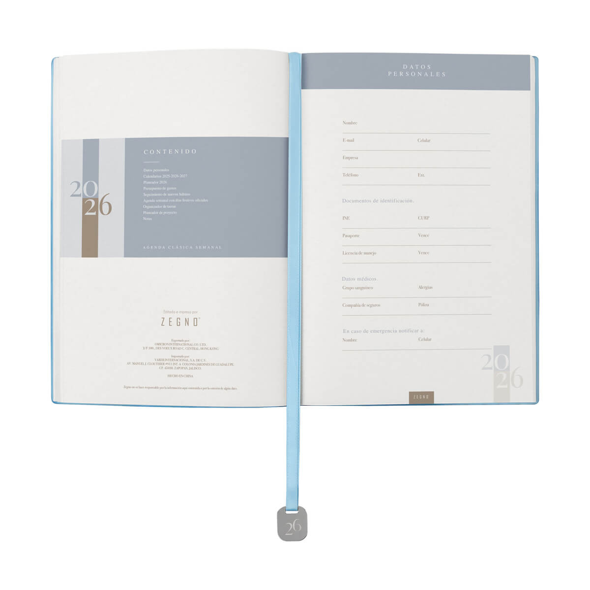 Incluye una caja individual del mismo color de la agenda, un separador con placa metálica y un bolígrafo elegante, lo que la convierte en un regalo listo para entregar.