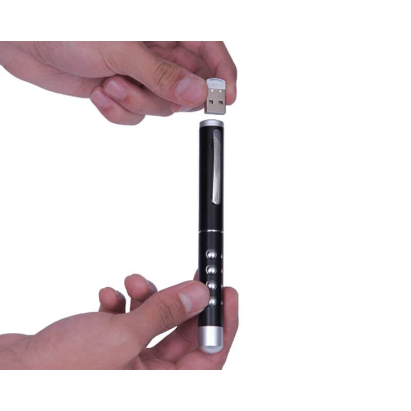 Apuntador láser y controlador para adelantar o atrasar presentaciones digitales, controlador de volumen, puede realizar función de ALT + TAB (cambio de ventana). Cuenta con dispositivo USB remoto para recibir la señal en RF (radio frecuencia). Incluye 1 batería AAA. Presentación: caja en color blanco.