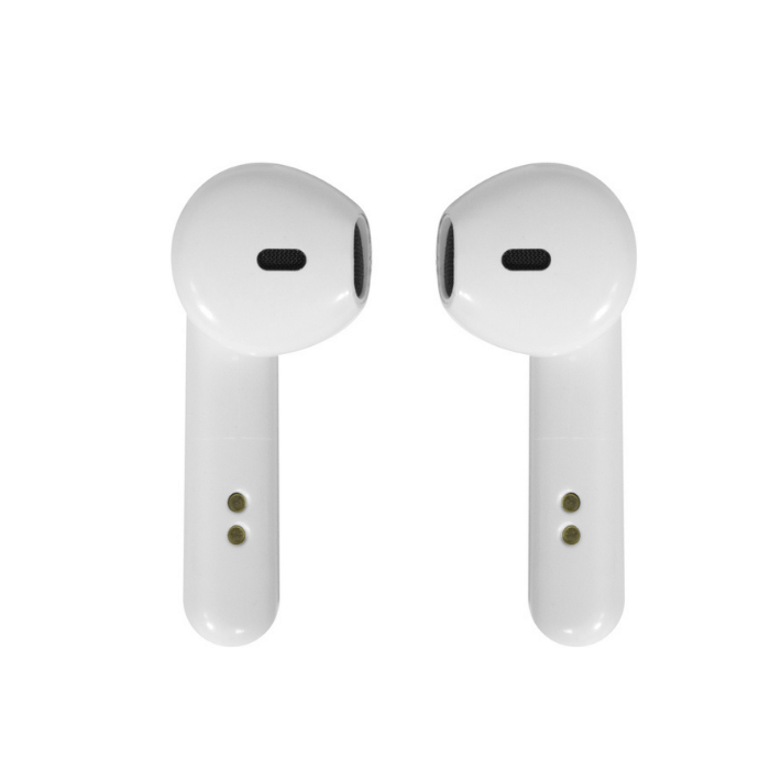 Audífonos bluetooth, se conectan al celular de forma inalámbrica. Los auriculares cuentan con función touch en cada costado de los audifonos (izquierdo y derecho) para funciones de avance, retroceso, reproducción y pausar musica. Así como también para las funciones de tomar y finalizar una llamada. Estuche que permite cargar la batería de los auriculares. Indicador de batería.