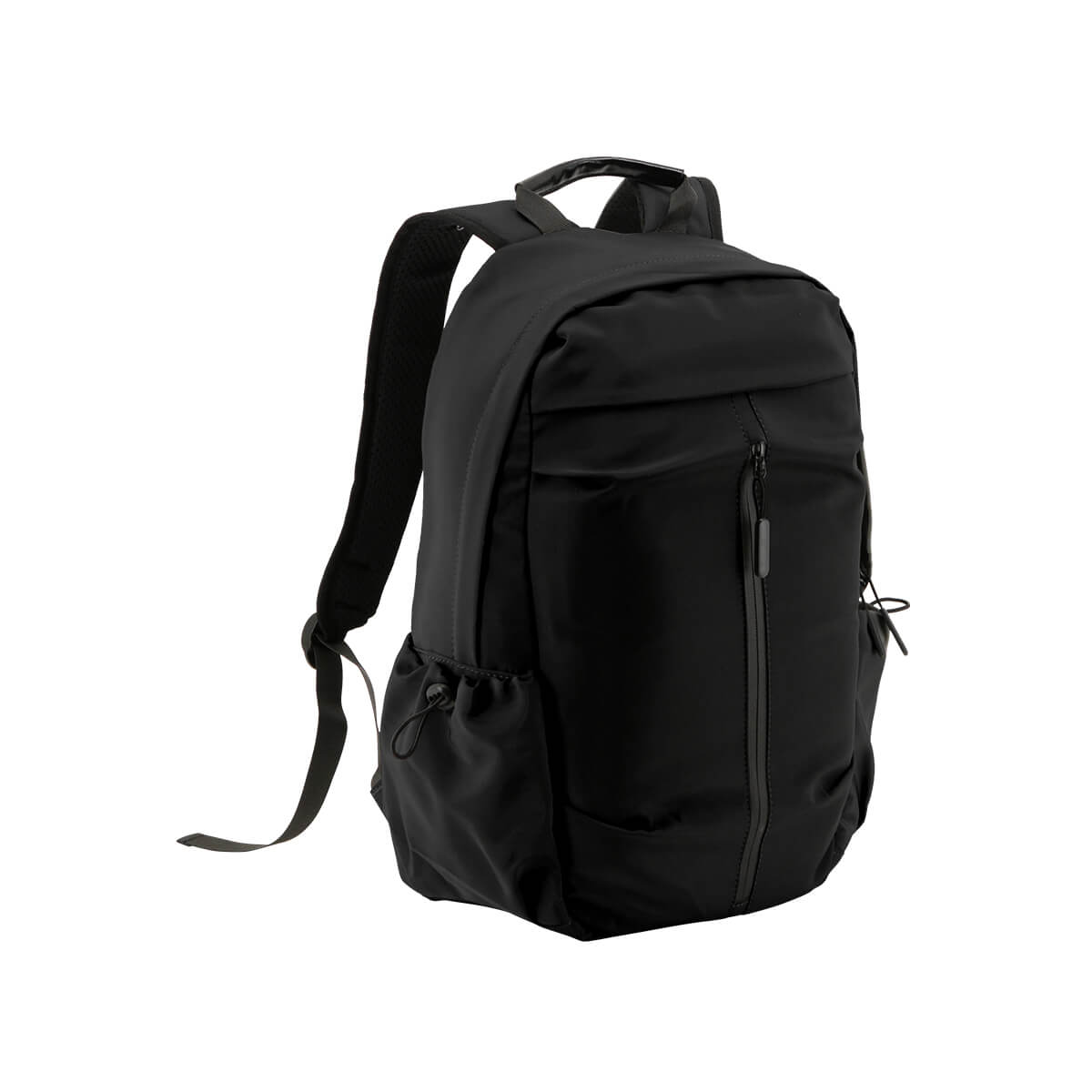 Backpack para Laptop fabricada en poliéster y nylon, con bolso frontal con cierre, y cable tipo USB en la parte interna de la backpack para cargar con tu power bank. Cuenta con 2 compartimentos interiores y espacio para laptop. Asa de curpiel y asa reforzada en la parte trasera para llevar sobre una maleta. Bolsillos laterales con jareta y tirantes ajustables.