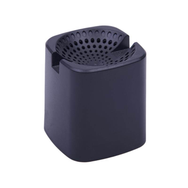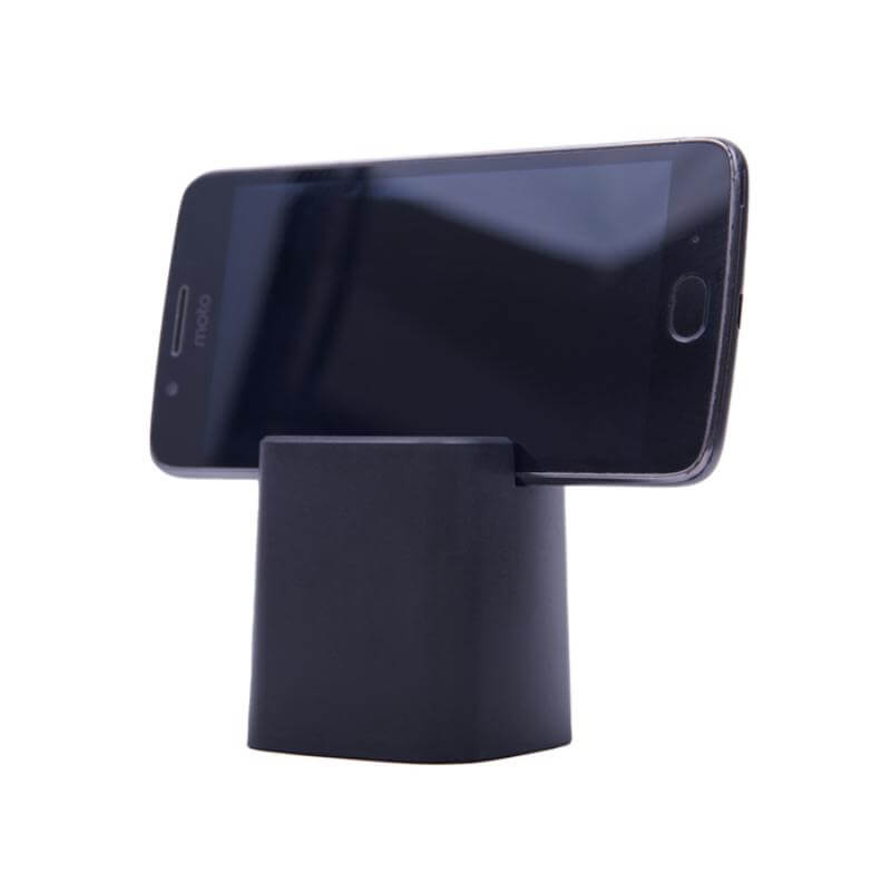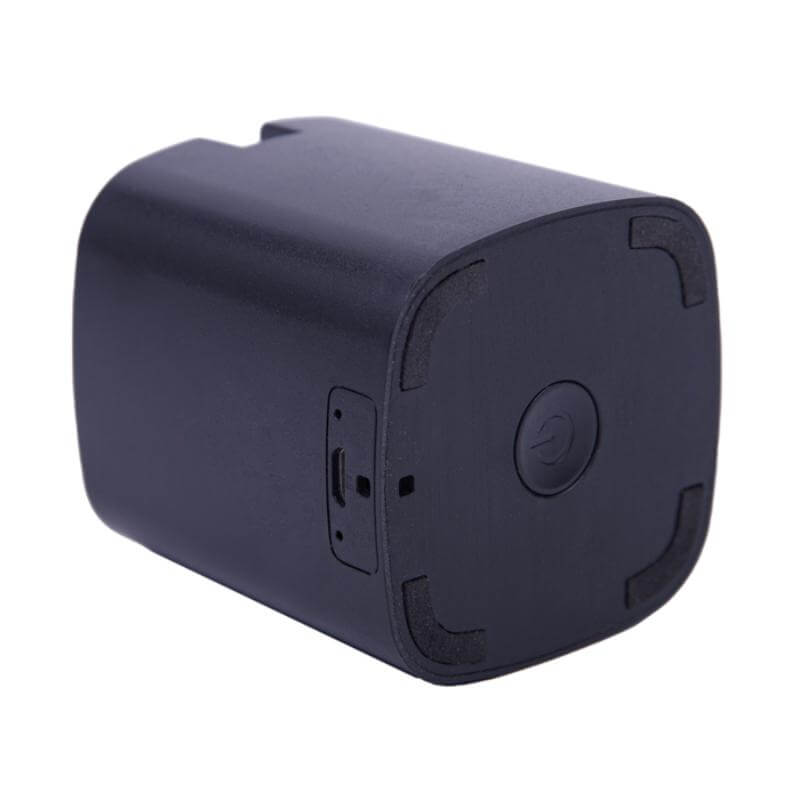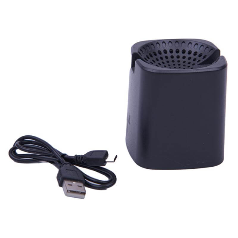 Bocina bluetooth con manos libres, ranura para colocar el teléfono en la bocina. Botón de encendido y cable de carga.