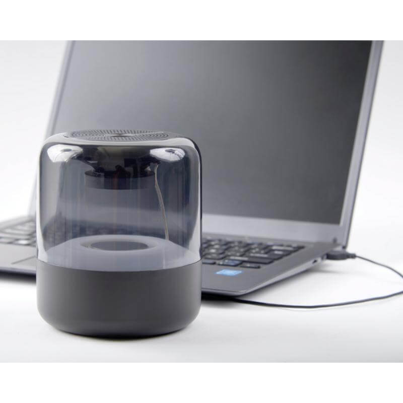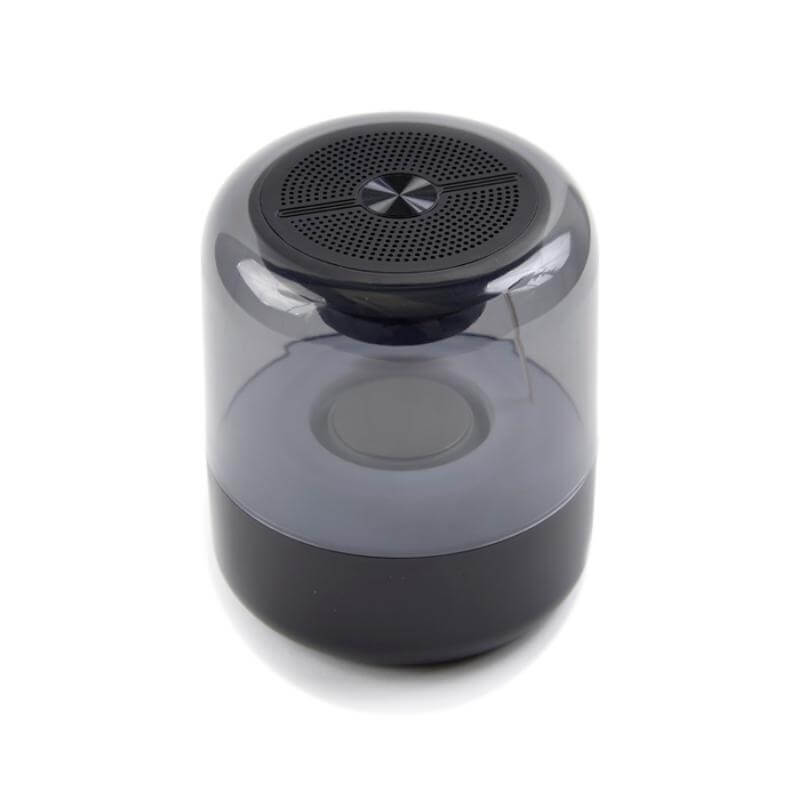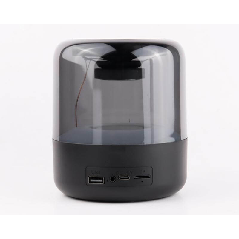 Bocina Bluetooth con cuerpo transparente y luz LED multicolor, cuenta con botón de encendido/apagado, botón para cambiar la modalidad de la luz, botón de reproducción/pausa, botón de cambio de función, botón para atrasar y adelantar. Entrada para USB, puerto de entrada AUX, puerto de carga tipo C (cable incluido) y entrada para tarjeta TF. Tiempo de reproducción 3-4 horas, tiempo de carga 3 horas, distancia del Bluetooth 10 metros. Cap. de batería 800 mAh. Incluye cable para carga tipo C. Presentación: caja en color blanco.