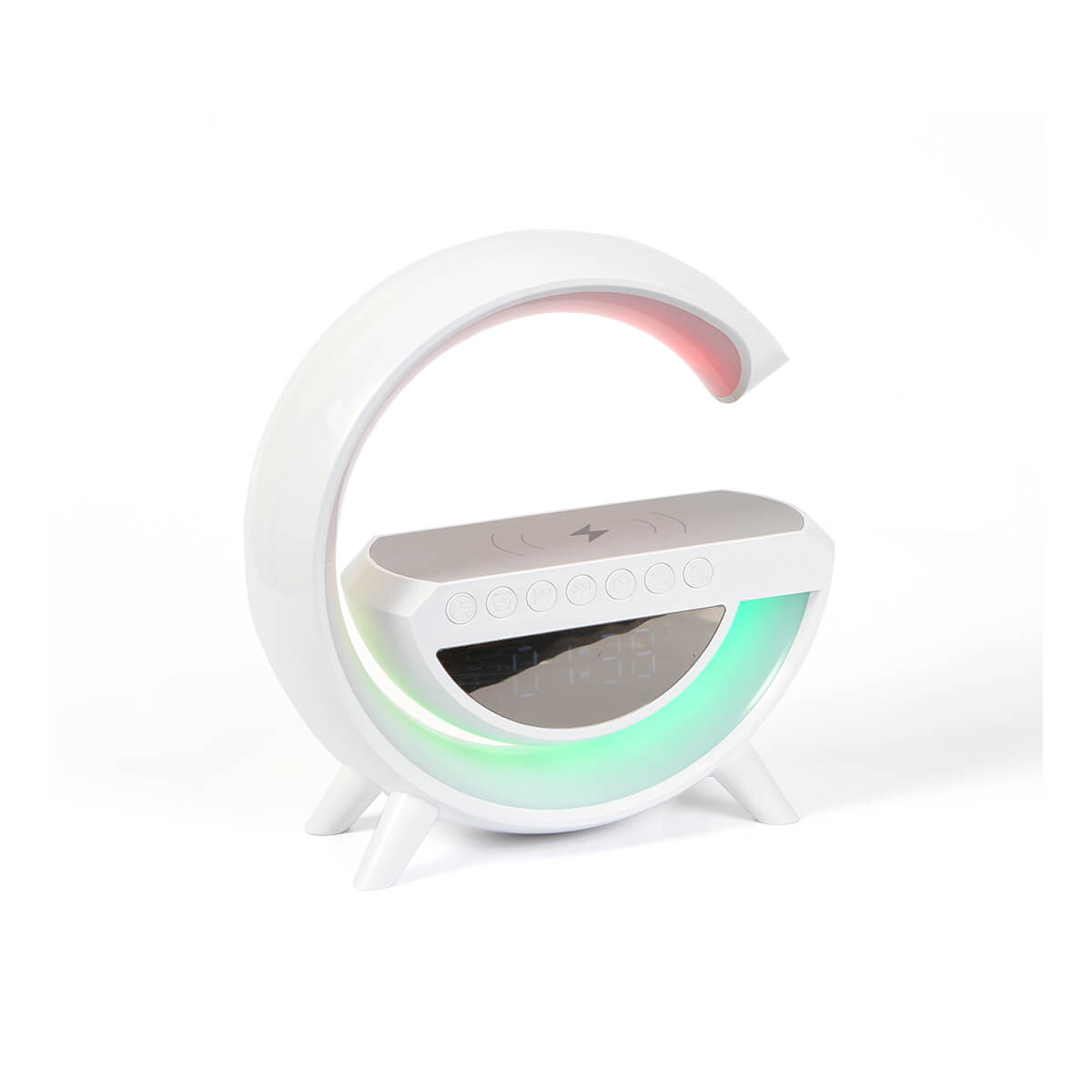 Bocina con conexión de sonido sin cables, diseño «G» es un dispositivo multifuncional que combina estilo y utilidad en un solo producto. Su diseño elegante y moderno, no solo ofrece un aspecto atractivo, sino que también integra diversas funciones para mejorar tu experiencia diaria. Incluye una lámpara incorporada que agrega un toque de iluminación ambiental a su espacio, reloj integrado en la bocina que te permite tener siempre a la vista la hora actual, brindándote una herramienta práctica y funcional para tu día a día y base de carga inalámbrica QI. Incluye caja de cartón individual y cable USB.