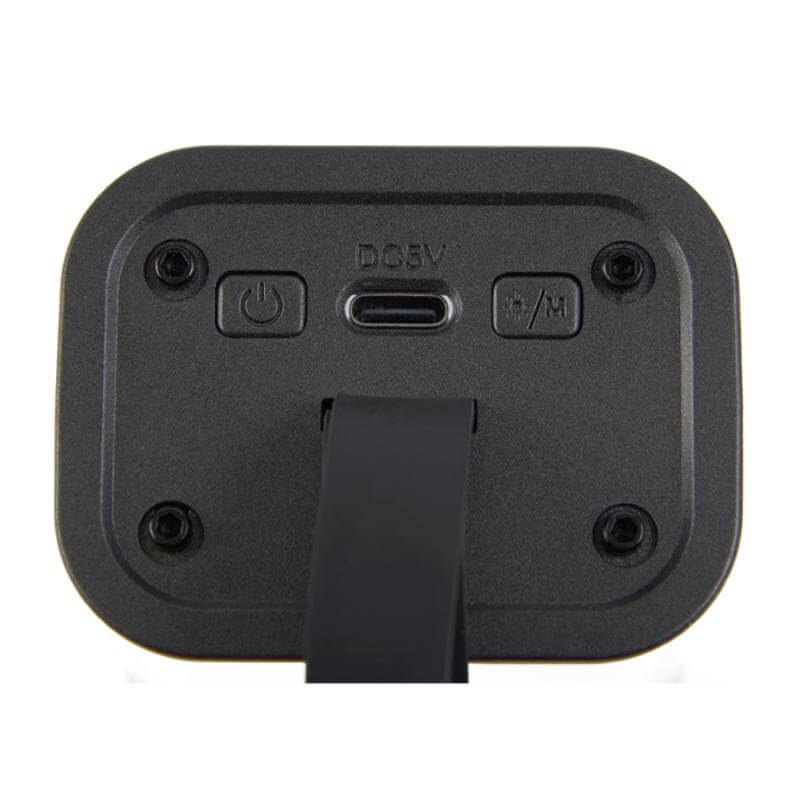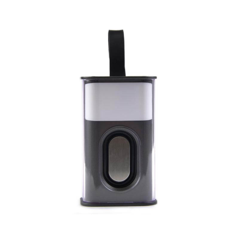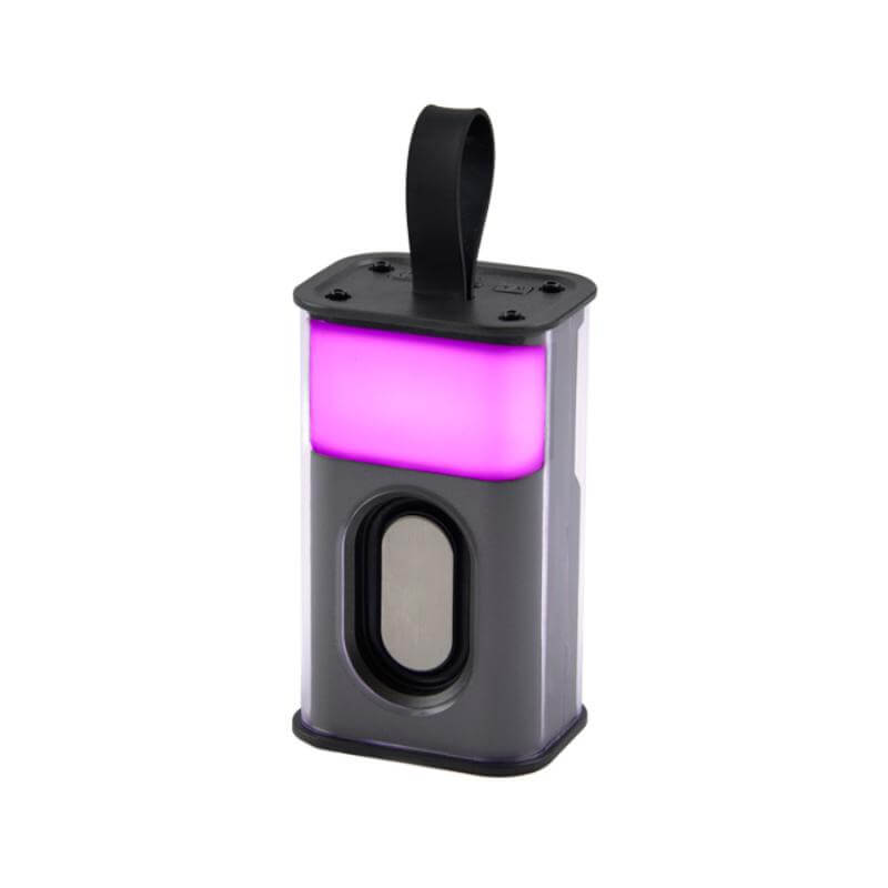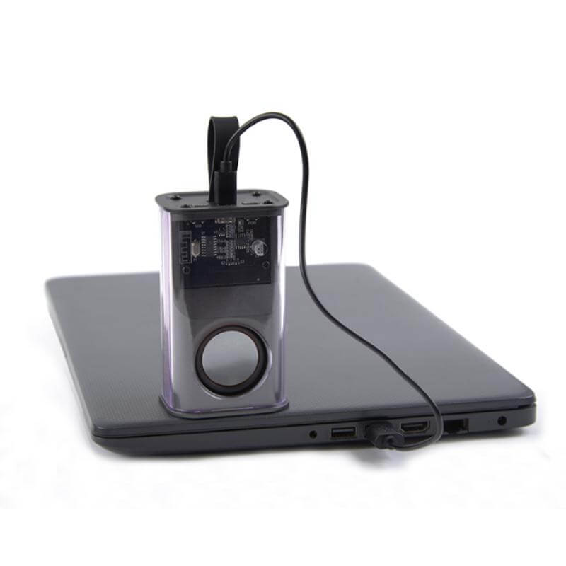 Bocina Bluetooth portátil con cuerpo transparente, woofer para mejor sonido, pantalla con luz LED multicolor y asa para colgar o trasportar. Cuenta con botón de encendido y apagado, botón para cambiar la modalidad de función y luz, entrada de carga de 2 horas, distancia de Bluetooth 10 metros. Cap. De batería 500 mAh. Incluye cable para carga tipo C. Presentación: caja en color blanco.