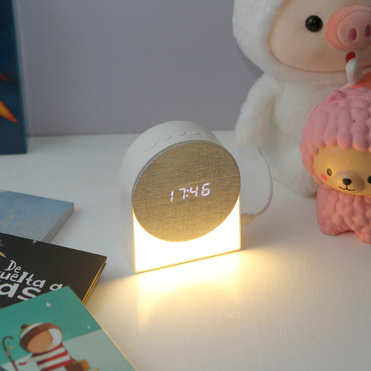 Bocina con conexión de sonido sin cables, con funciones de reloj, alarma, luz nocturna y ruido blanco. Diseño especial para casos de insomnio, cuenta con sonidos de descanso terapéutico predeterminados. Potencia de 3W y batería integrada de iones de litio.