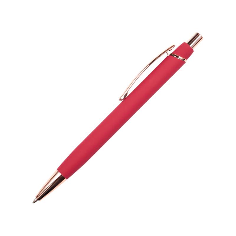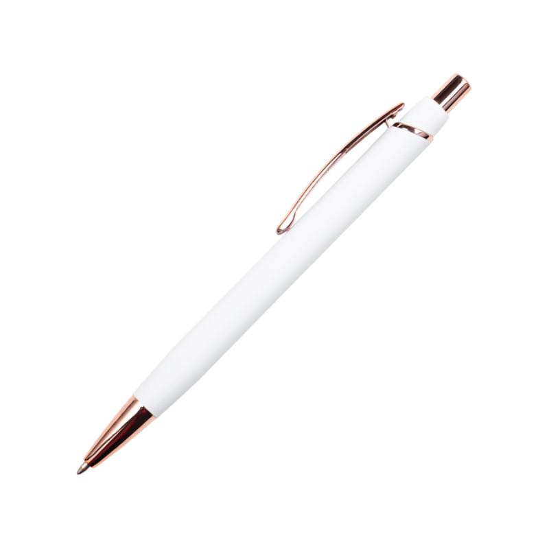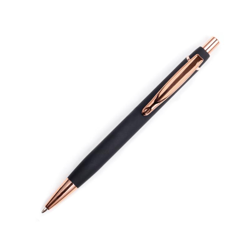 Bolígrafo de aluminio con mecanismo de click, acabado de goma suave al tacto y detalles en oro rosa (punta, clip y botón). Al grabar en laser CO2, destapa en color oro rosa.
