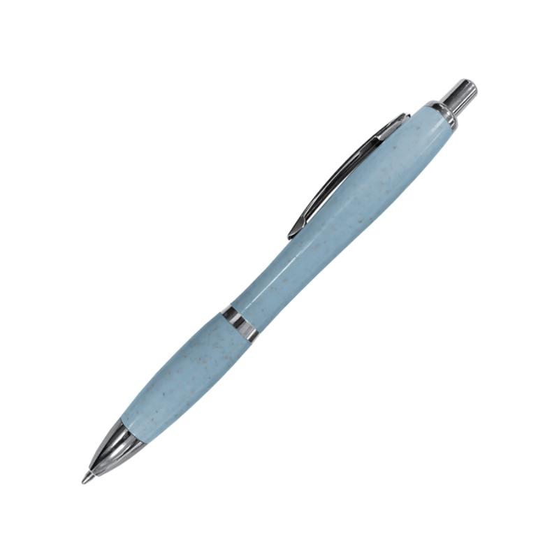 Bolígrafo ecológico y reciclable, con cuerpo de plástico ABS y \fibra de Trigo\, tiene clip metálico, cuenta con punta, clip y detalle al centro en color cromo. Mecanismo de click.