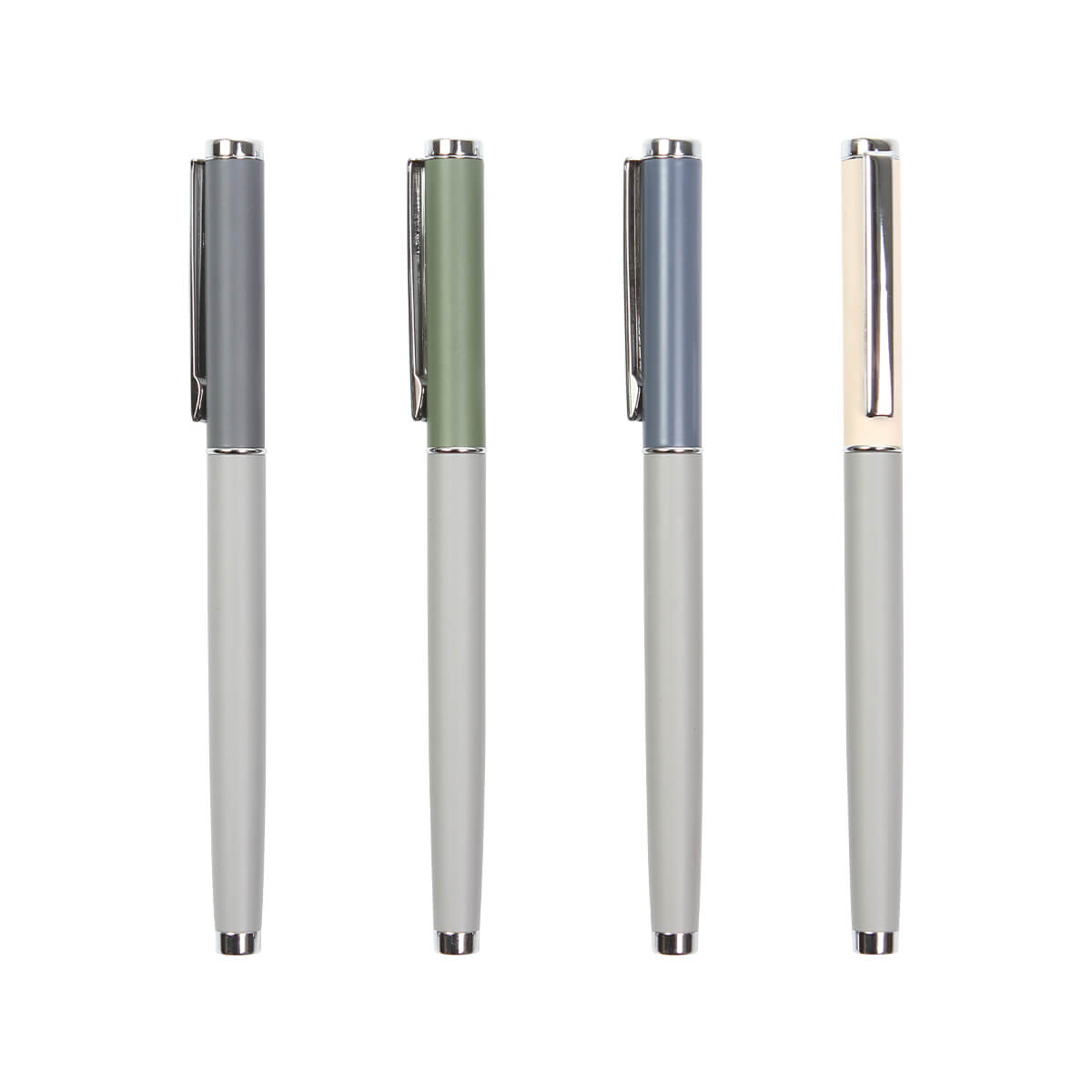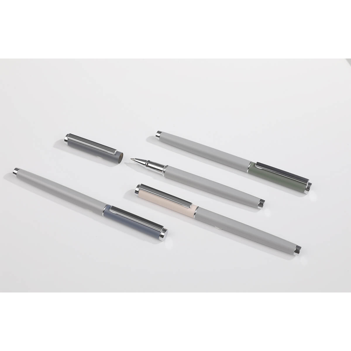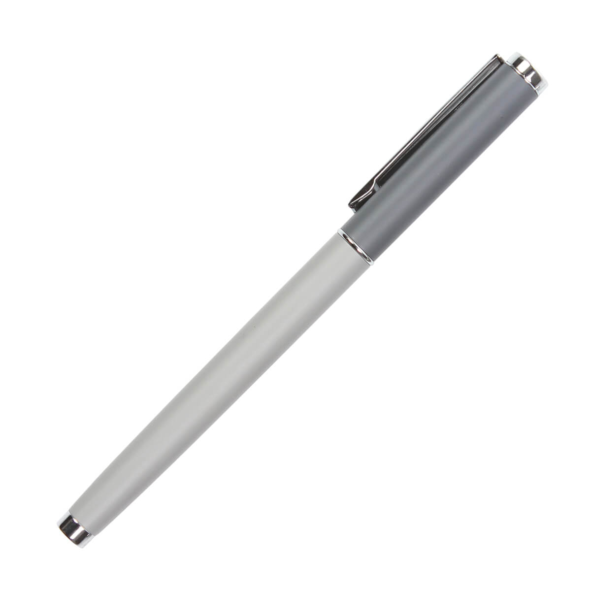 Bolígrafo con mecanismo roll, cuerpo rociado metálico, adornos cromados y recarga de tinta enrollable. Barril fabricado en acero inoxidable. Tinta de escritura negra.