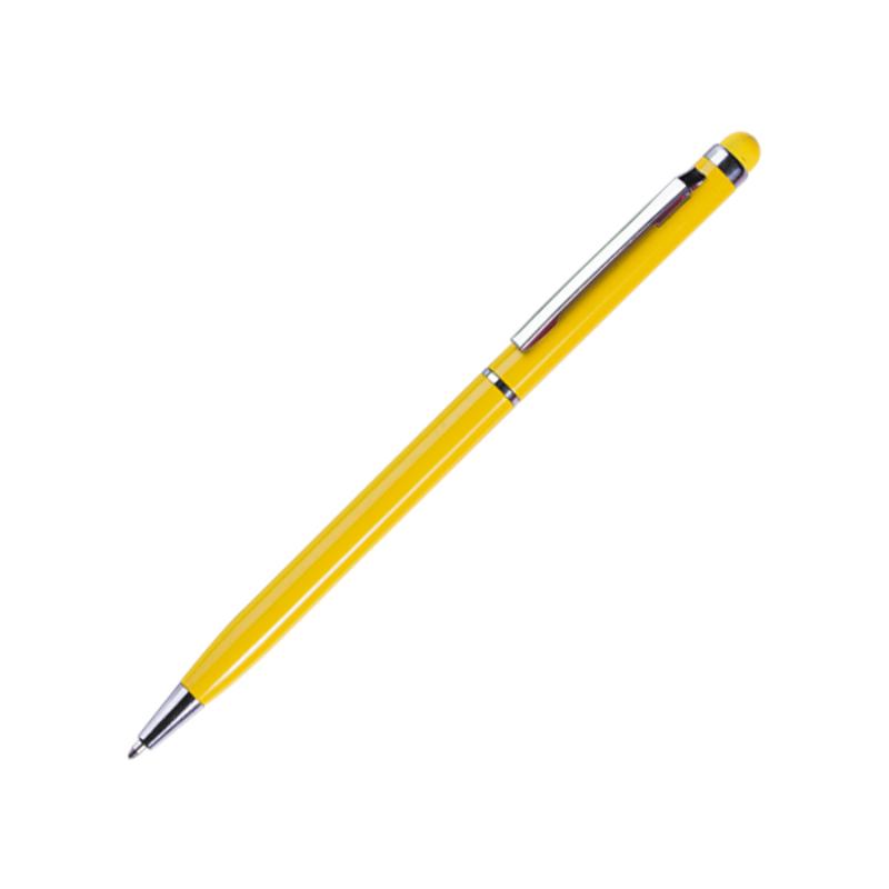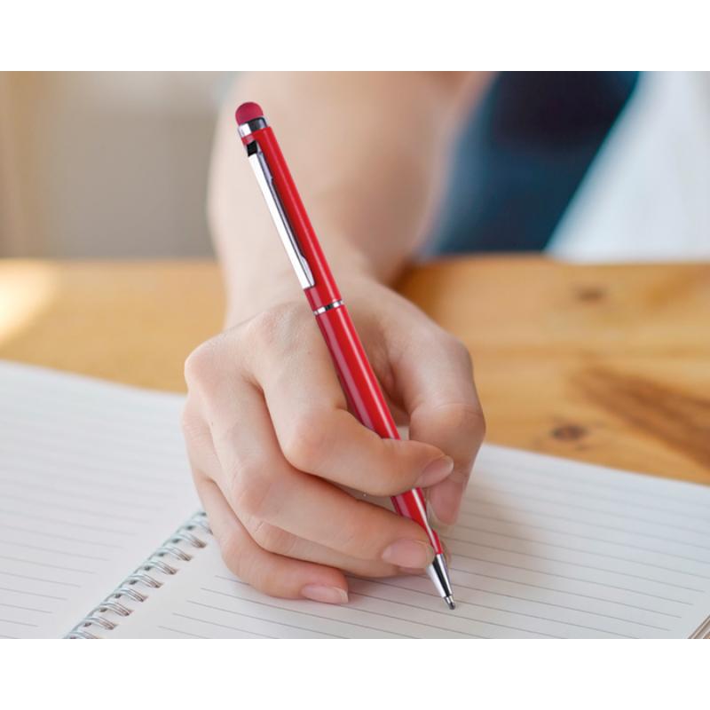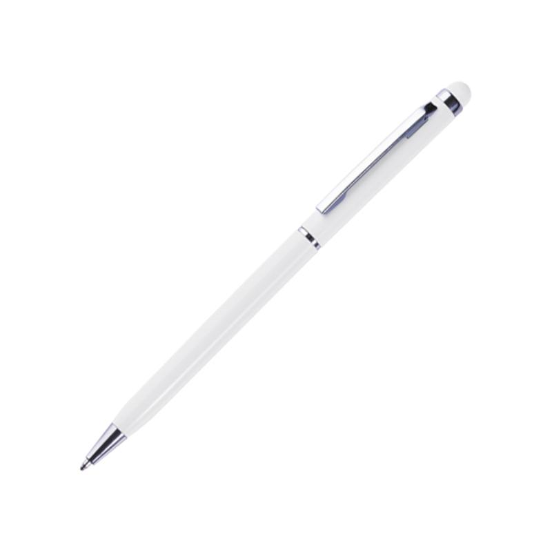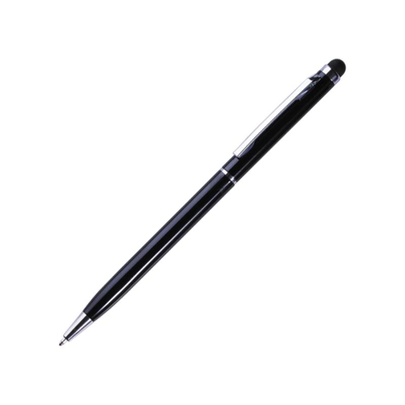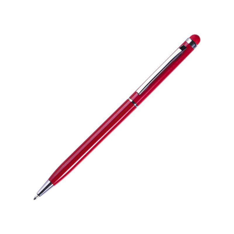 Bolígrafo metálico delgado y ligero de tinta azul, es de color sólido con acabado brillante, cuenta con clip, punta y detalles en cromo. Tiene touch del color del bolígrafo para dispositivos táctiles. Mecanismo retráctil.