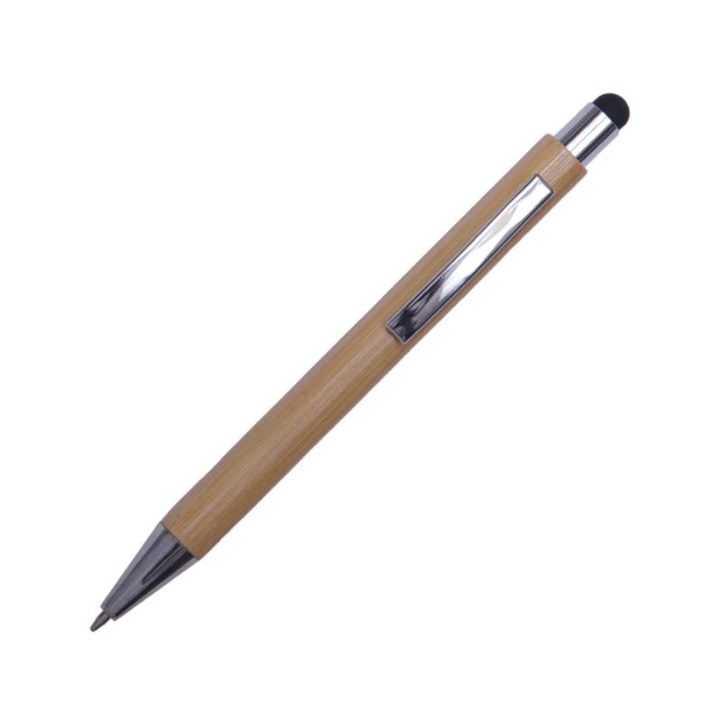 Bolígrafo de bambú, clip y punta metálico. Con punta touch para pantallas táctiles. Mecanismo de click.