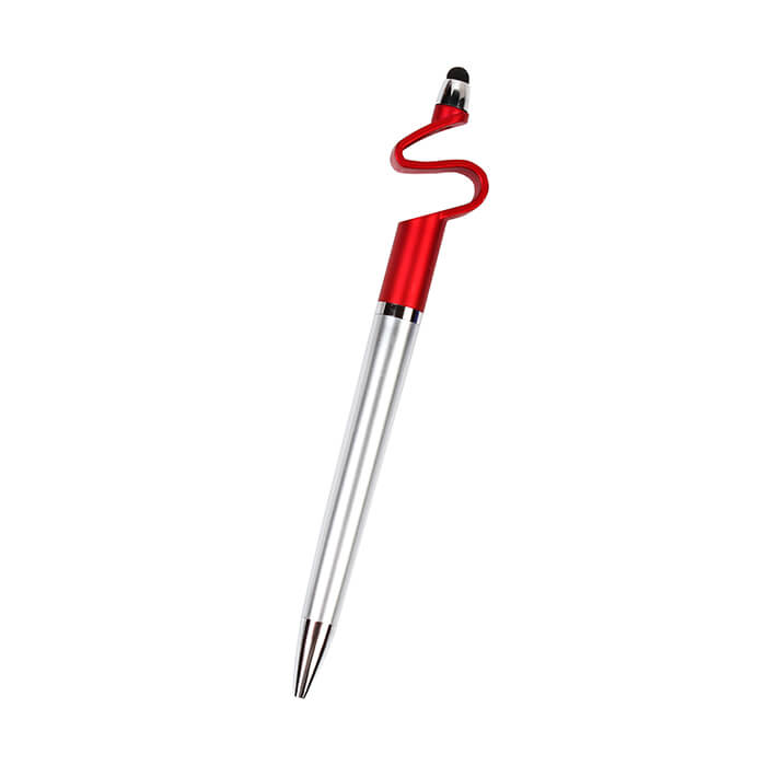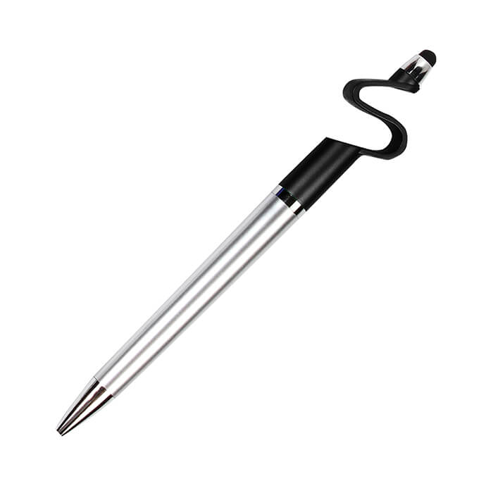 Bolígrafo de plástico con puntero touch y diseño base para celular con tinta negra.
