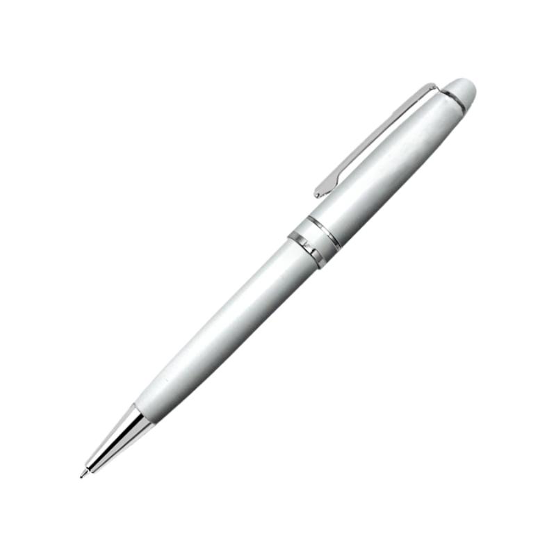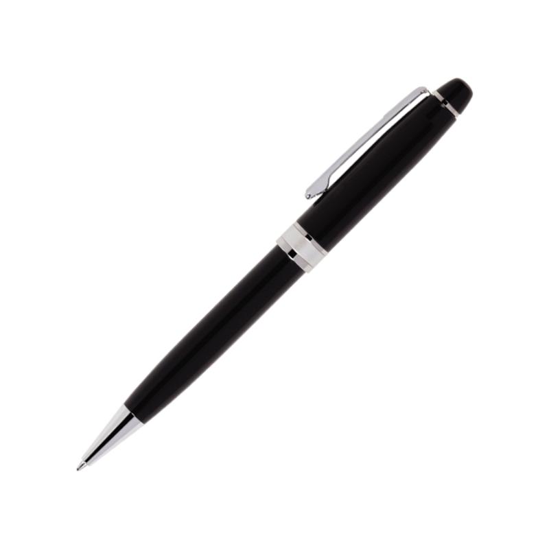 Bolígrafo metálico, cintillo metálico, punta y clip de acero. Mecanismo retráctil. Presentación: caja en color negro.