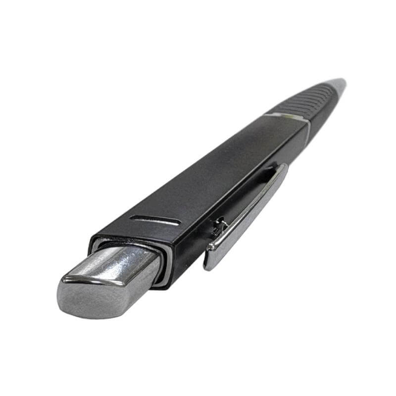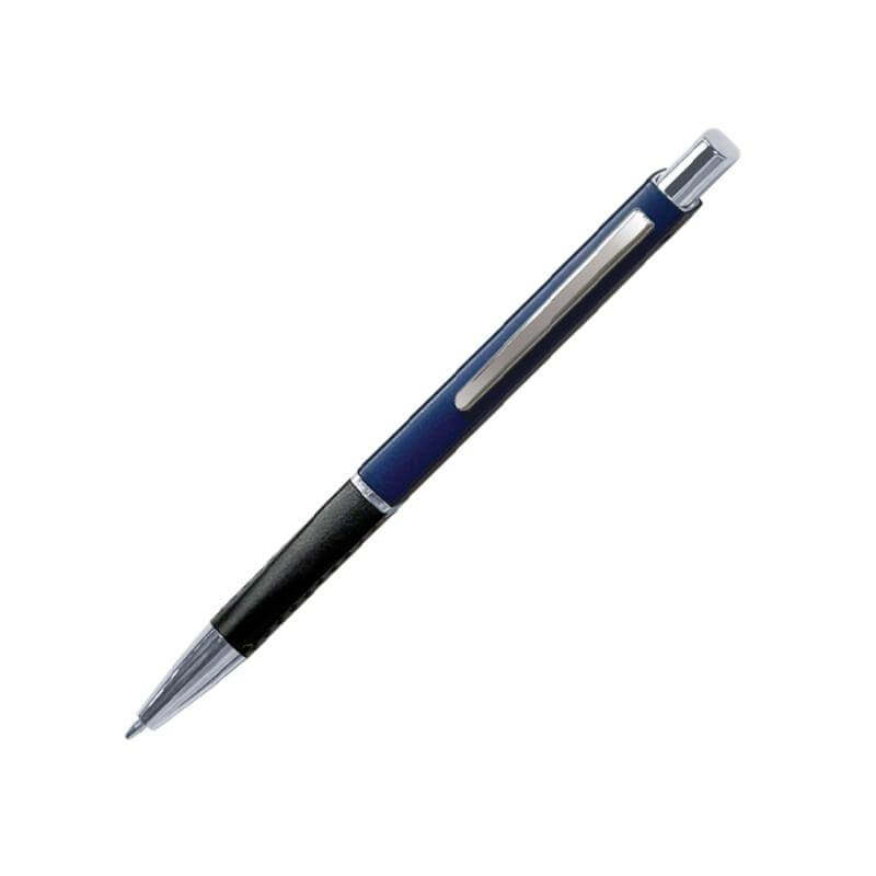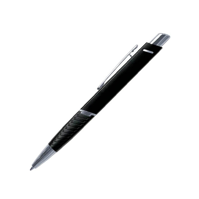 Bolígrafo de aluminio con forma cuadrada, con excelente área para personalizar. Cuenta con punta, clip, aro central y botón en cromo, grip negro con textura. Tinta alemana negra. Mecanismo de click.