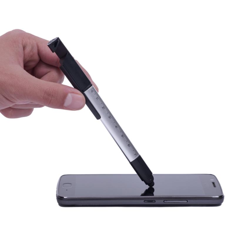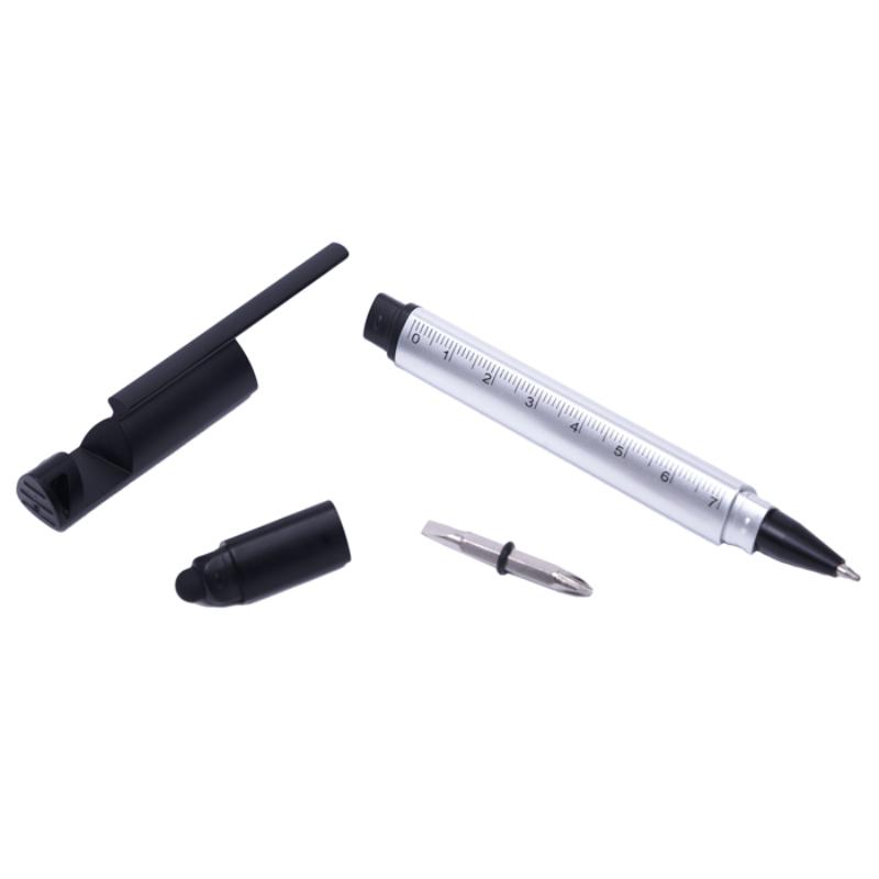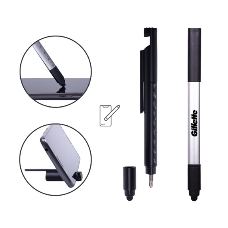Bolígrafo de plástico 5 en 1, diseño de cuerpo triangular que cuenta con regla de 7 cm. Punta touch para pantallas táctiles. Se puede utilizar como desarmador incluye 2 puntas plano y de cruz que se fija y guarda en el cuerpo de la pluma. Tapa extraíble diseñada para usarse como base de teléfono celular.
