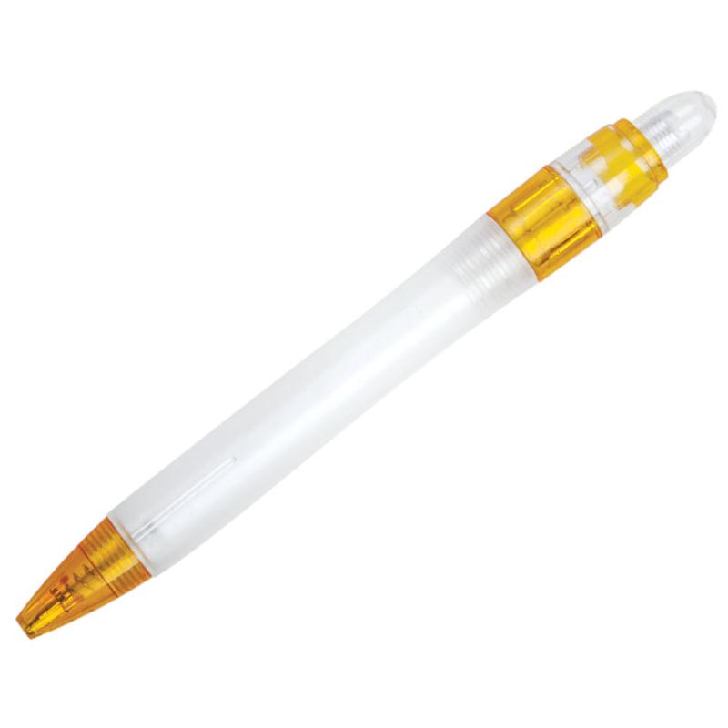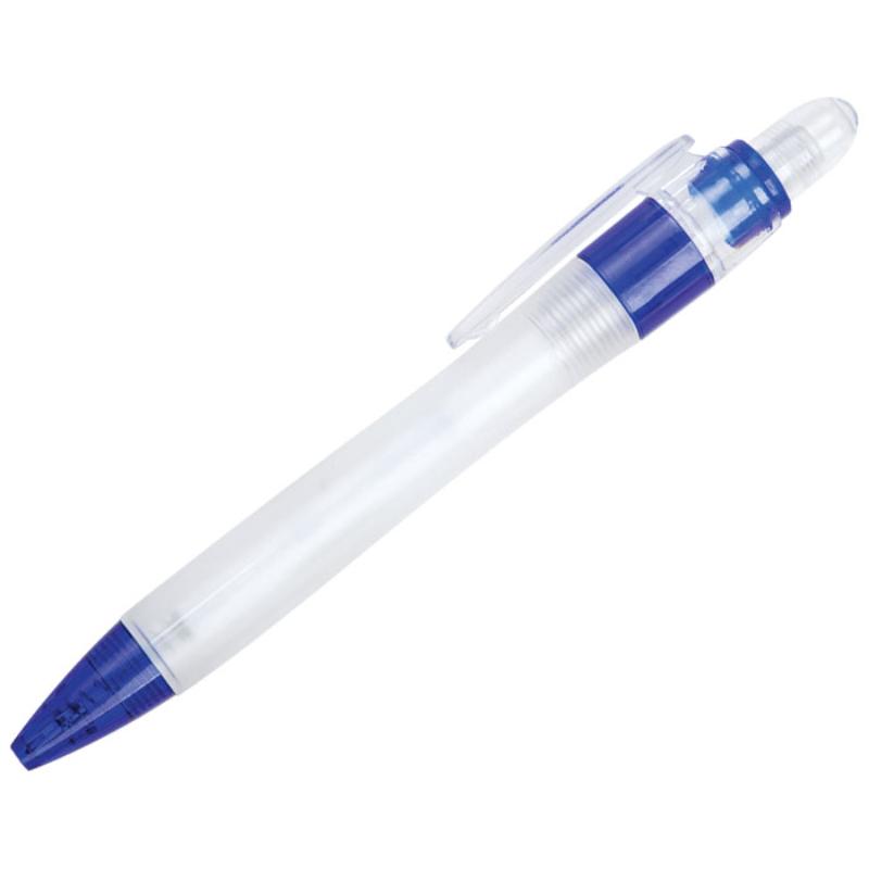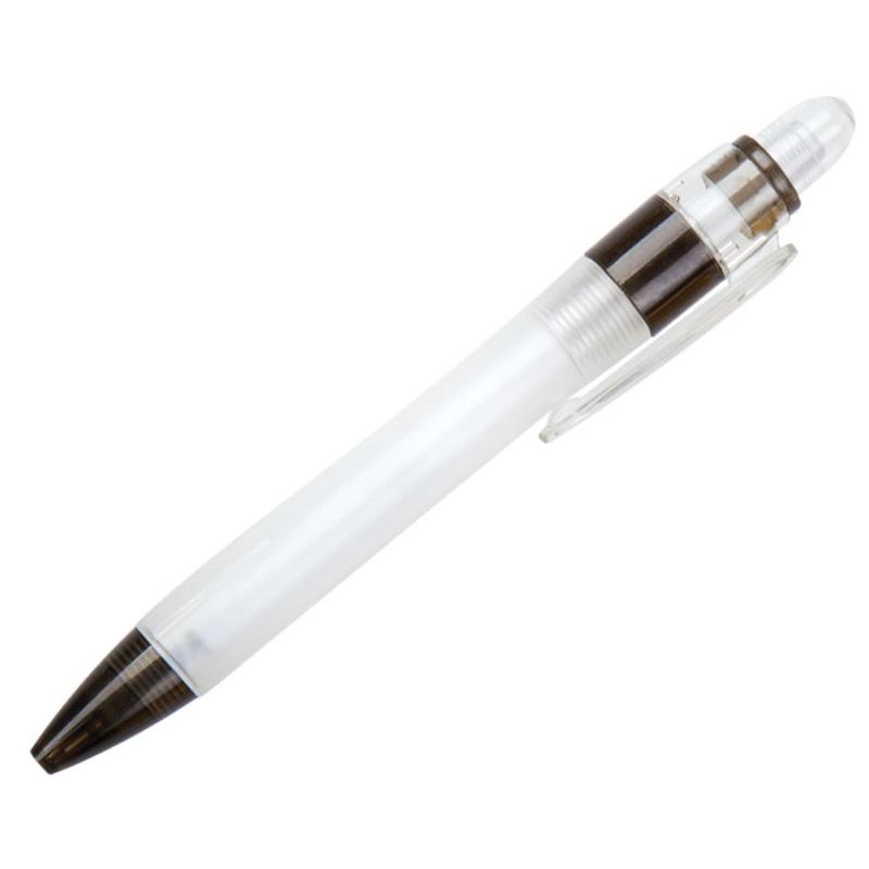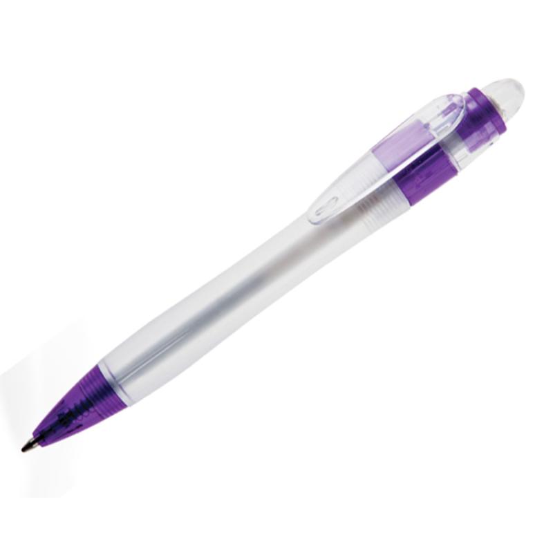 Bolígrafo de plástico, cuerpo traslúcido y detalles en color. Mecanismo de click.