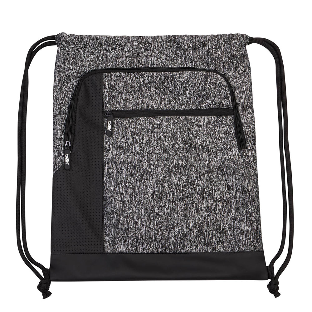 Bolsa-mochila con tirantes gruesos de cordón y cerrado de jareta. Cuenta con 2 bolsas frontales con cierre y compartimento interno plastificado impermeable.
