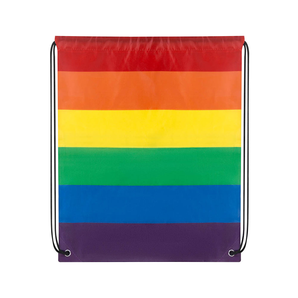 Bolsa-mochila con tirantes de cordón y cerrado de jareta. Su diseño arcoíris, colorido y alegre refleja la diversidad y la inclusividad.