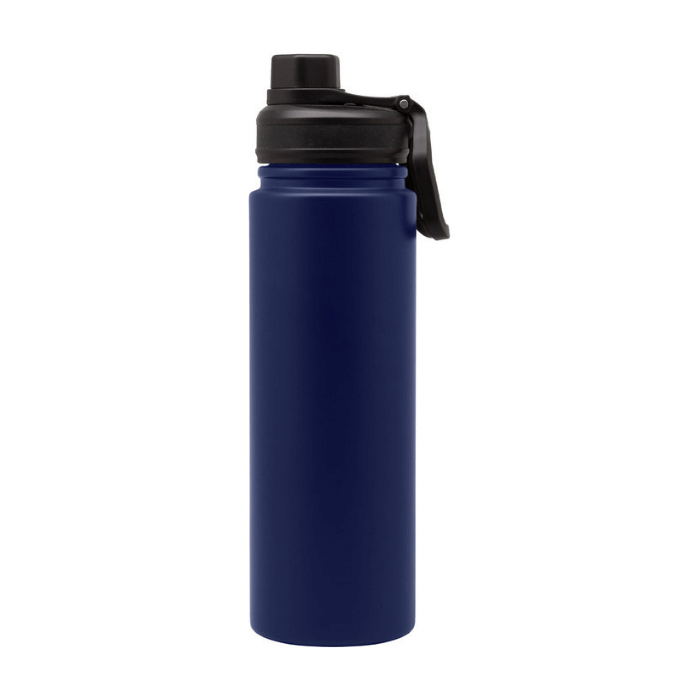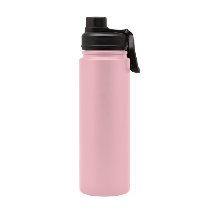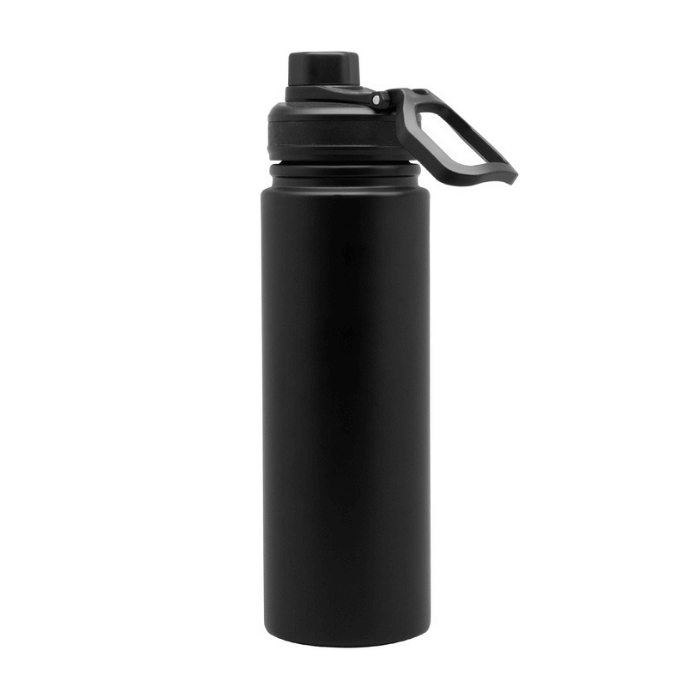 Botella doble pared, sellada al vacío. Interior en acero 304 y exterior en acero 201. Tapa con anillo de silicona, boquilla con cierre a rosca antiderrame y manija plástica para su agarre. Mantiene hasta 12 hs la temperatura de las bebidas calientes y 24 hs de las bebidas frías.