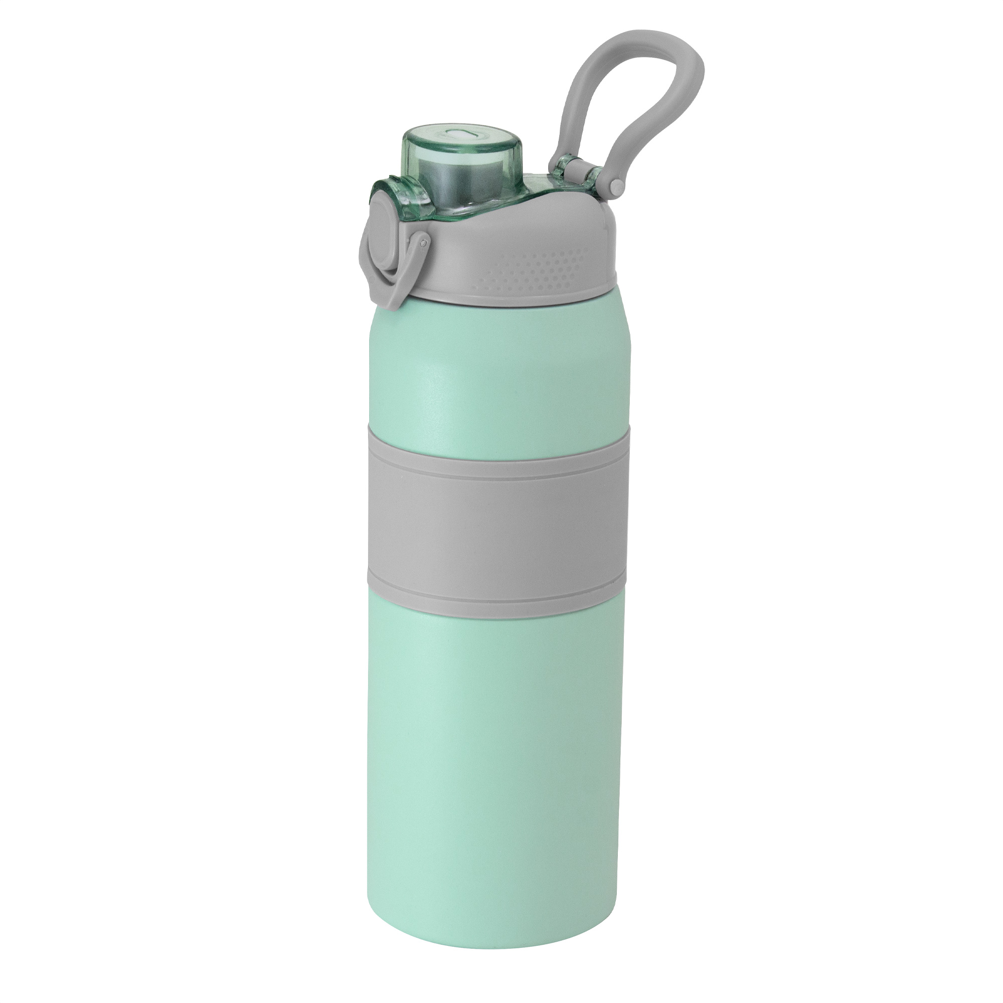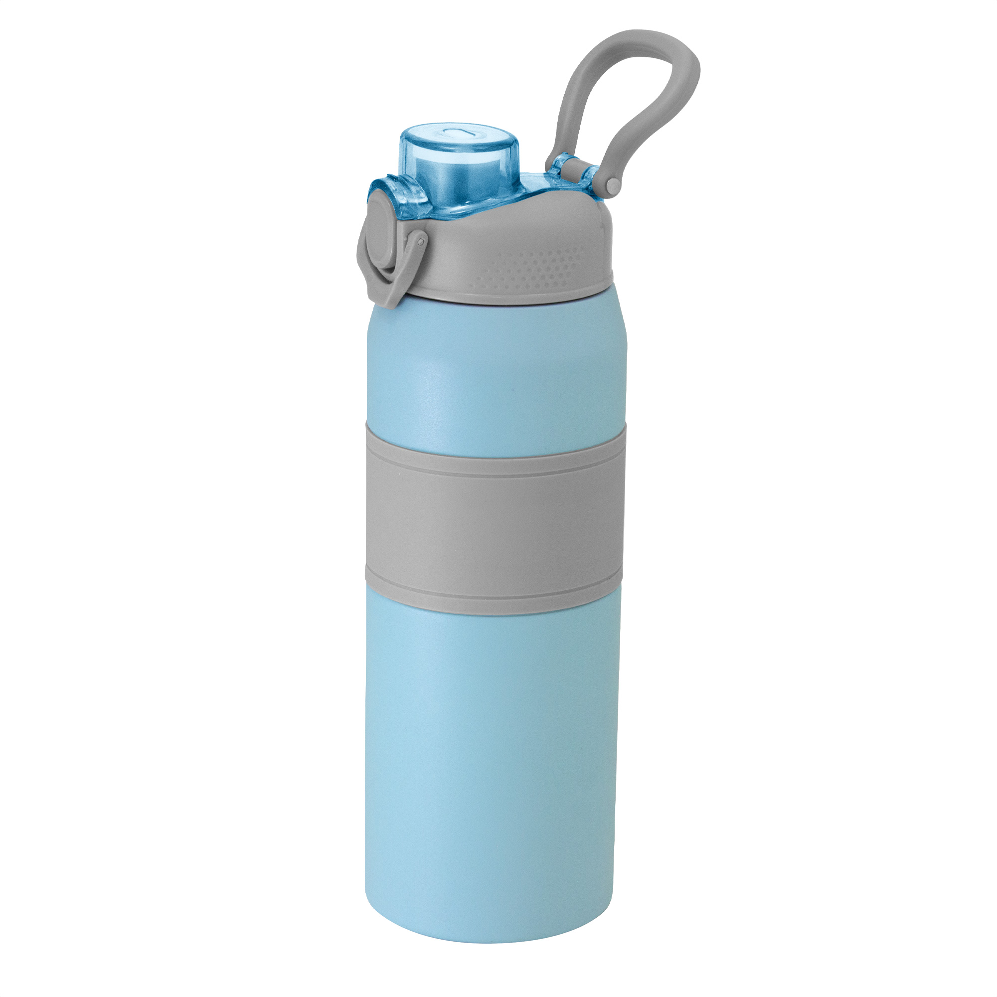 Termo botella deportiva con doble pared, sellada al vacío. Interior de acero 304 y exterior de acero 201. Pintura powder coat (pintura más duradera y resistente a la corrosión y el paso del tiempo). Tapa plástica a rosca en color gris con anillo de silicona y manija plástica para su agarre, combinada con tapa rebatible en colores translucidos a juego con el color de la botella.