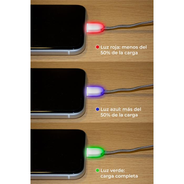 Cargador tipo C y Iphone con anillo para enganche o colocar llaves.. Luz indicadora de carga del celular, cuando el color es rojo la batería del celular posee una carga menor al 50%, azul del 51 al 99% y verde cuando está totalmente cargada.