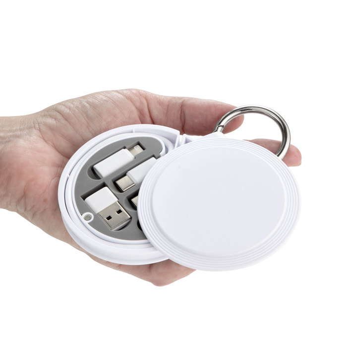 Cable de carga rápida. Estuche circular con mosquetón. Accesorios: 1 cable de carga rápida USB tipo C a USB tipo C de 60 W con transferencia de datos, 1 adaptador USB standard, 1 adaptador Lightning y 1 adaptador micro USB. Cierre magnético. Apertura por deslizamiento.