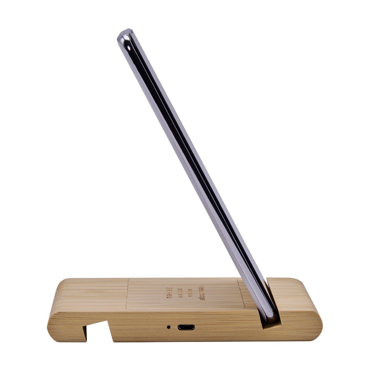 Cargador inalámbrico multifuncion con soporte para smartphones y tablets. Incluye LED indicador de carga en proceso y cable con entrada USB y micro USB. Potencia de carga de 5W. Incluye cable cargador. El bambú es un producto natural el cual puede presentar variaciones en tonalidades y vetas.