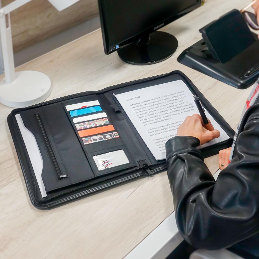 Carpeta con cierre. Contiene 1 bloc de 20 hojas lisas tamaño A4. Porta bolígrafo. Bolsillo externo. Compartimentos internos para 7 tarjetas. Sobre con fuelle y bolsillo interno con cierre. Diseñada con materiales que poseen algunos beneficios ambientales sobre el cuero genuino, ya que no requiere de animales para su fabricación y además, no necesita ser químicamente curtido.