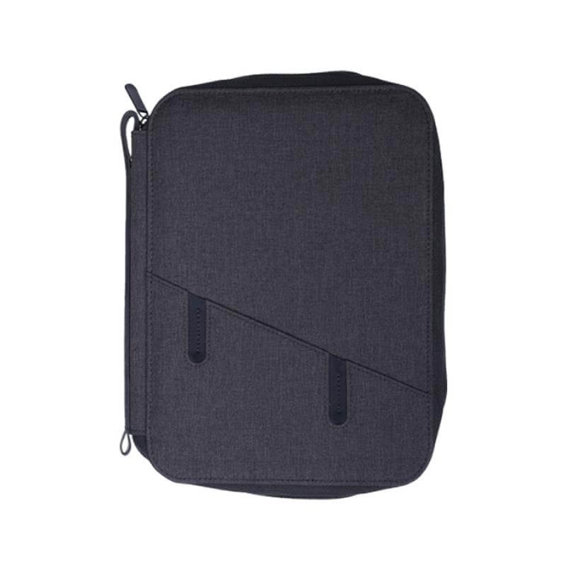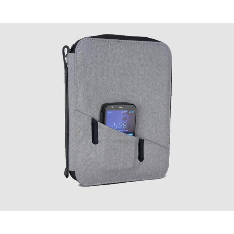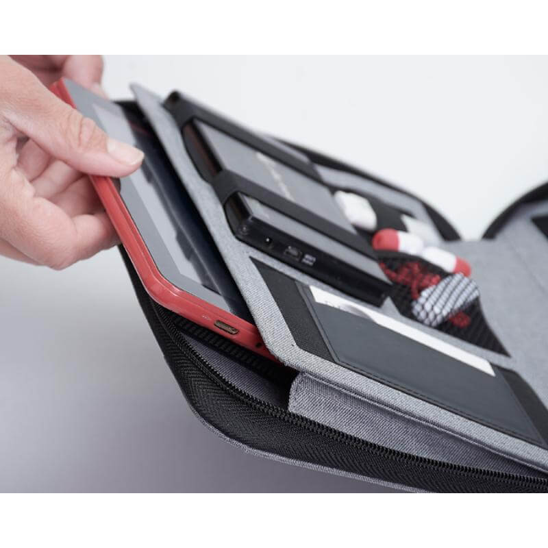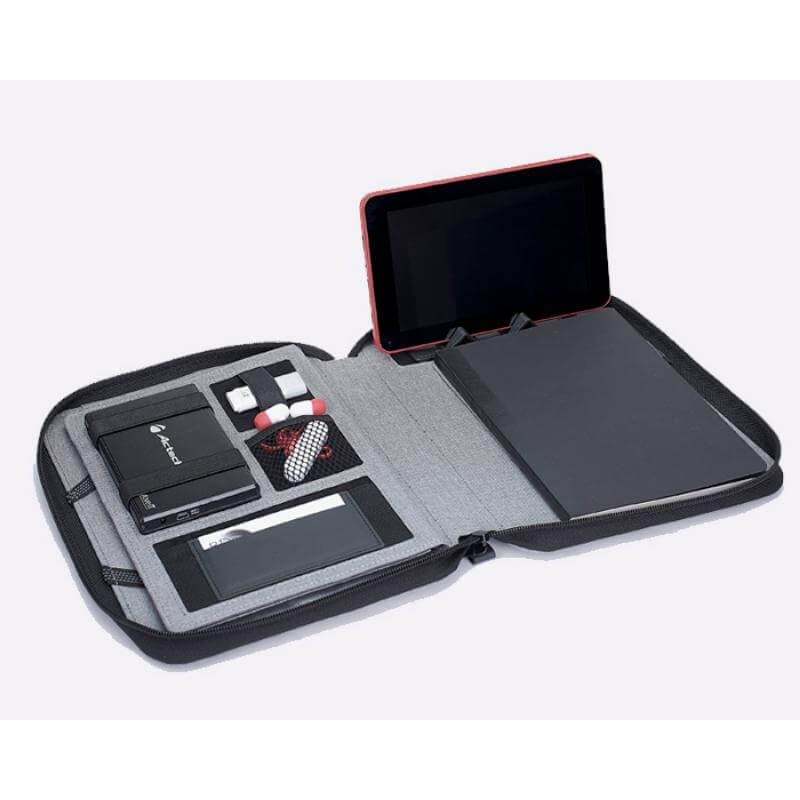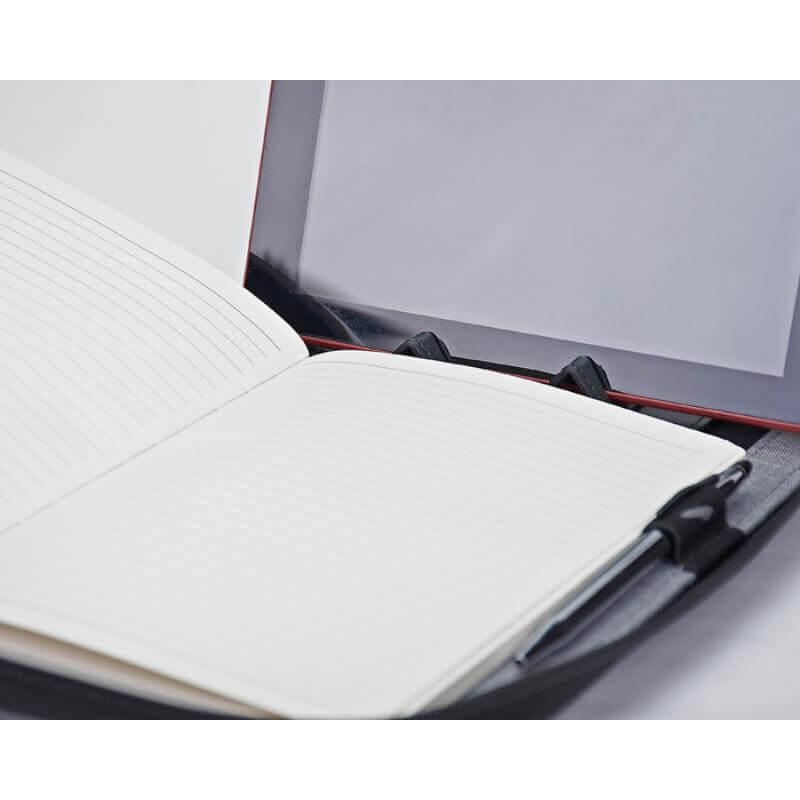 Moderna carpeta multiusos con cierre, con exterior e interior en tela. Incluye libreta tamaña A5 de 64 hojas rayadas (128 páginas). Cuenta con funda al frente para Smartphone, compartimento interior para tablet, 2 soportes ajustables portatablet o portacelular, cinta elástica para Smartphone y cinta elástica para memorias USB u otros accesorios, compartimento con ventana plástica para credenciales, divisiones para tarjetas, bolsa de malla, agarradera exterior con broche de presión, así como cinta elástica para fijar bolígrafo (no incluido).