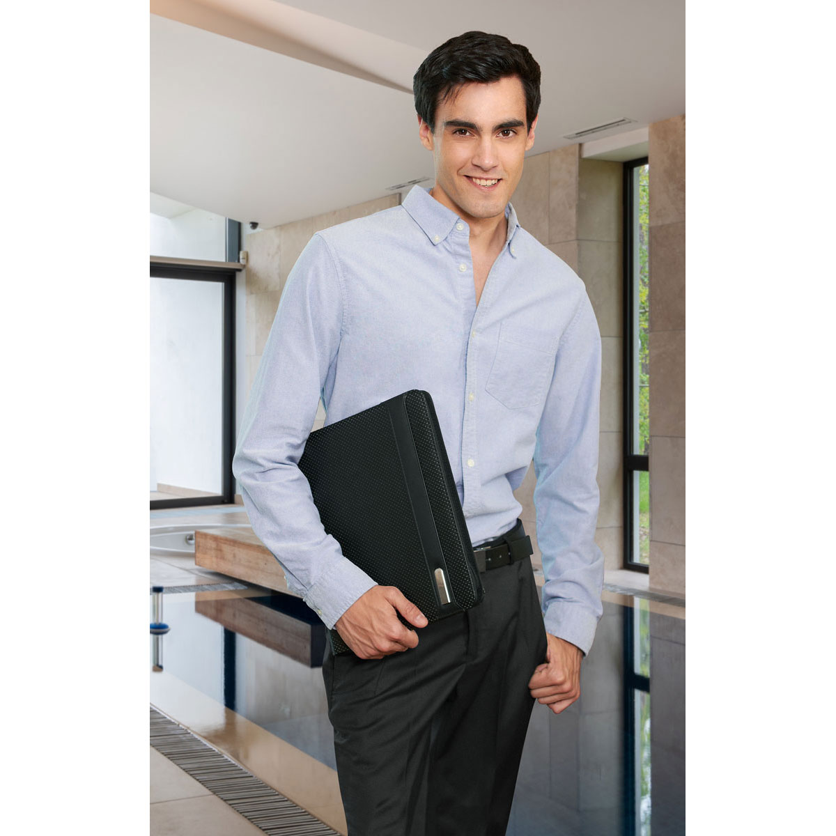 Carpeta con cierre y placa metálica. Incluye block de raya tamaño A4 con 20 hojas. Incluye elástico para bolígrafo, compartimento para smartphone y tarjetas. No incluye bolígrafo.