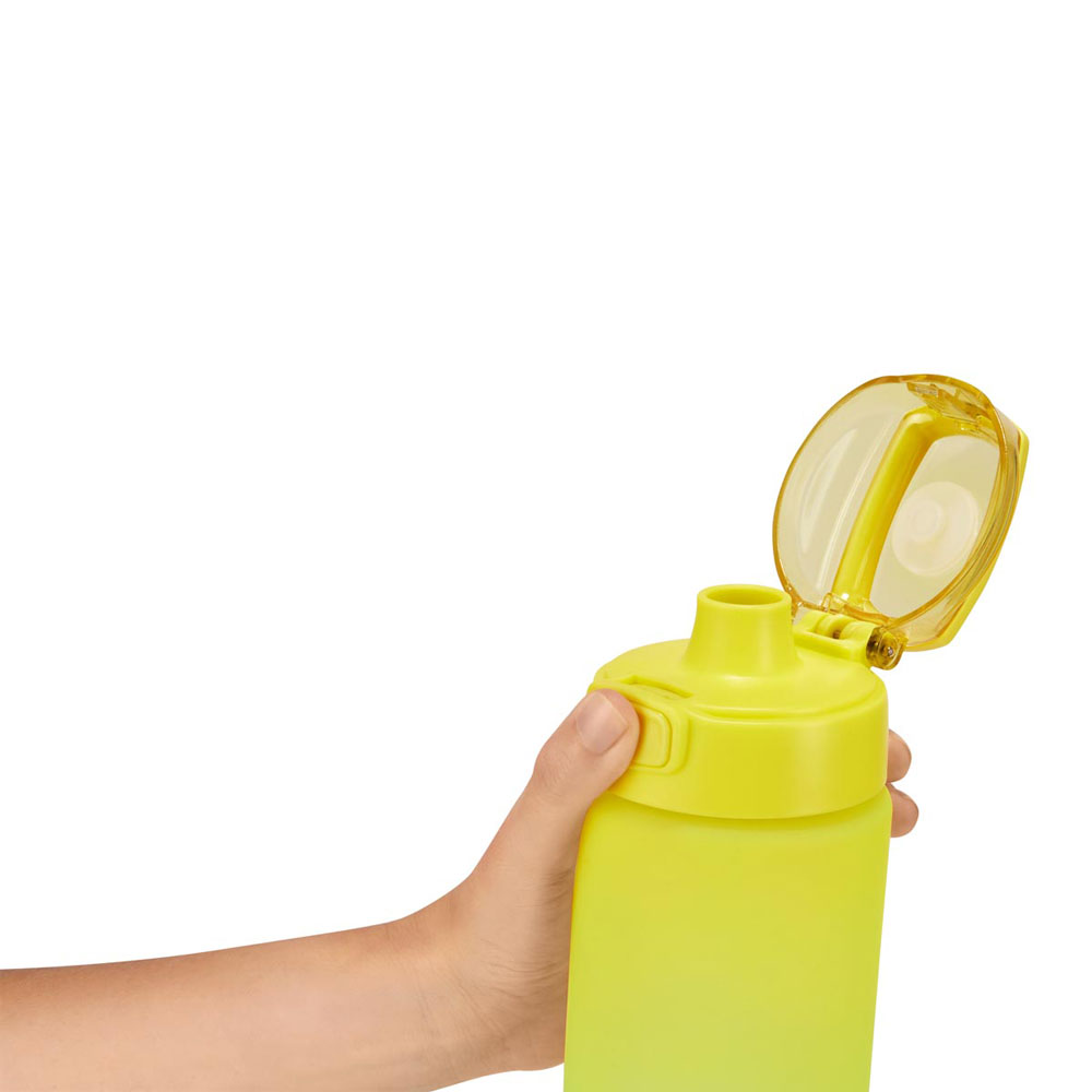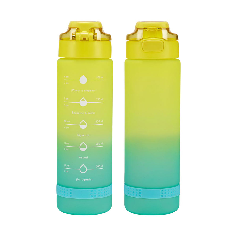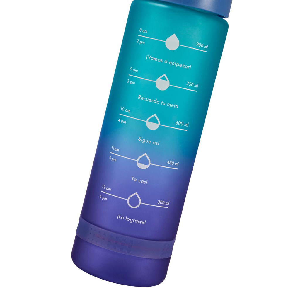 Tapa de plástico con cierre de rosca hermética y boquilla. Sobretapa push con botón. y asa plegable. Cuerpo con terminado tipo rubber, suave al tacto. Cuenta con un detalle de silicon en la parte inferior. Incluye marcador de mililitros y horas lo que te permite medir fácilmente la cantidad de agua que bebes a lo largo del día y llevar un control de tu hidratación. Incluye caja individual.
