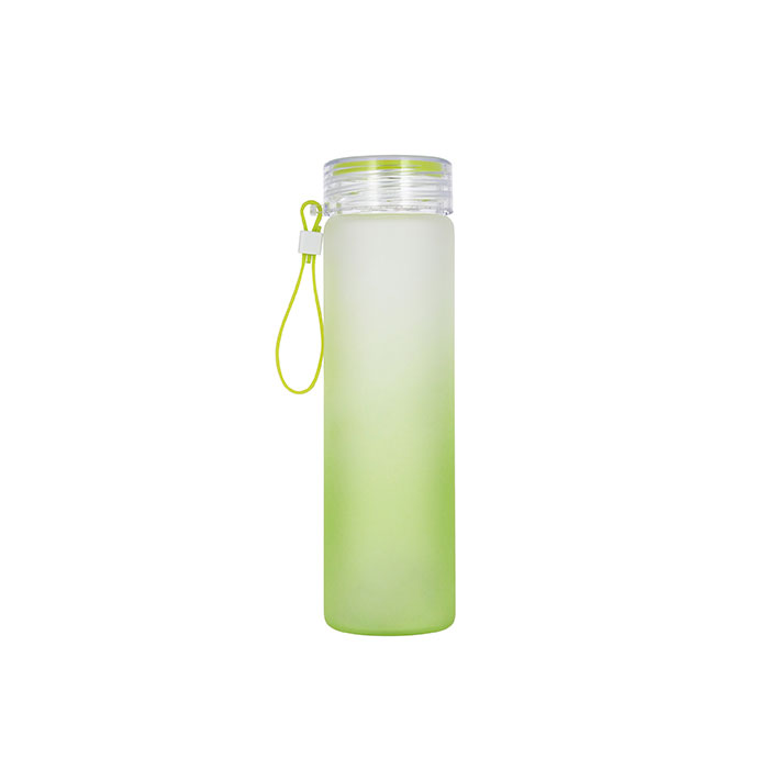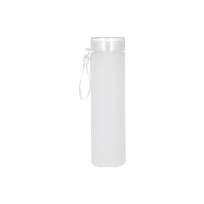 Botella de vidrio para agua con tapa tipo rosca y correa de silicón.