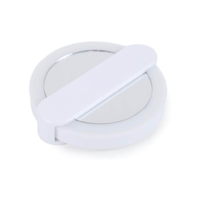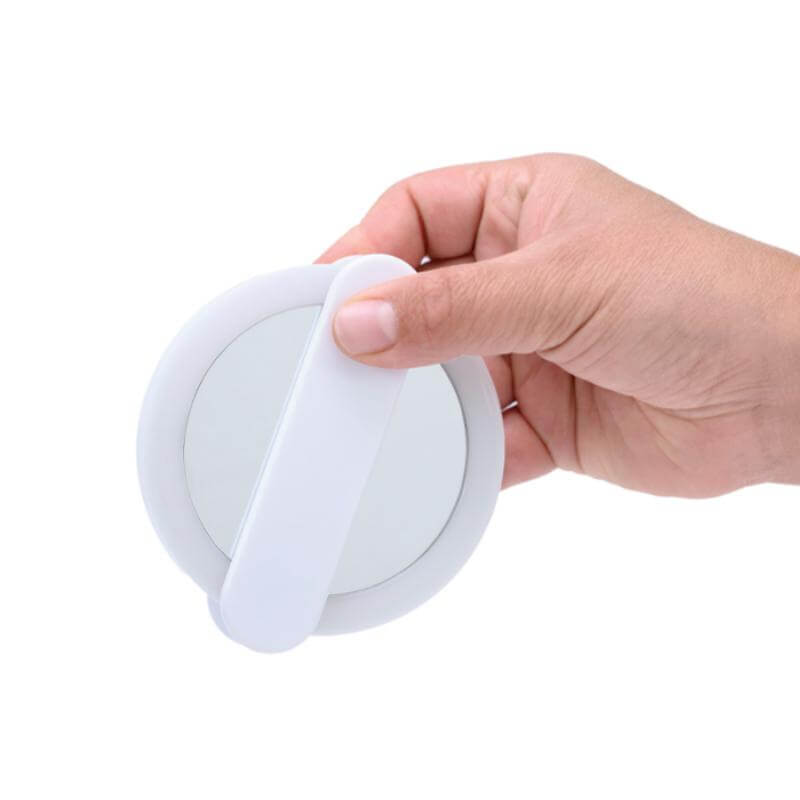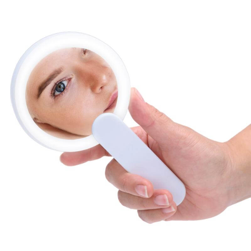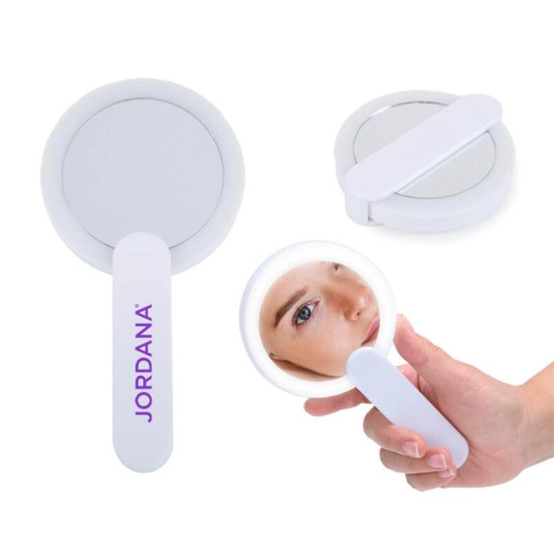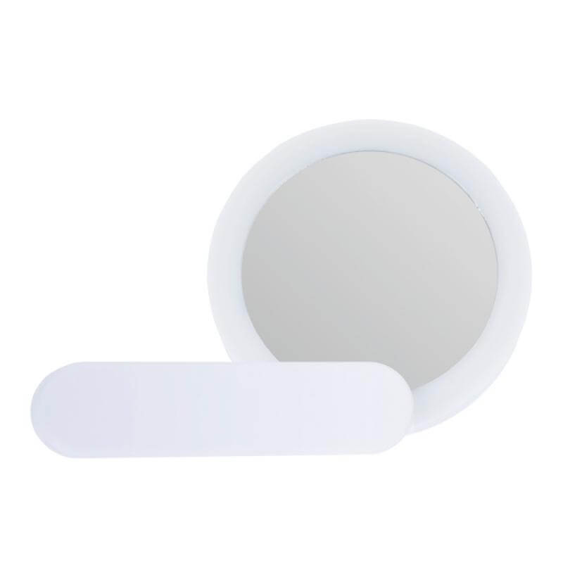 Espejo de bolsillo con 12 luces LED y mango giratorio que sirve como soporte. Tiene botón de encendido y apagado. Incluye 2 baterías de botón.