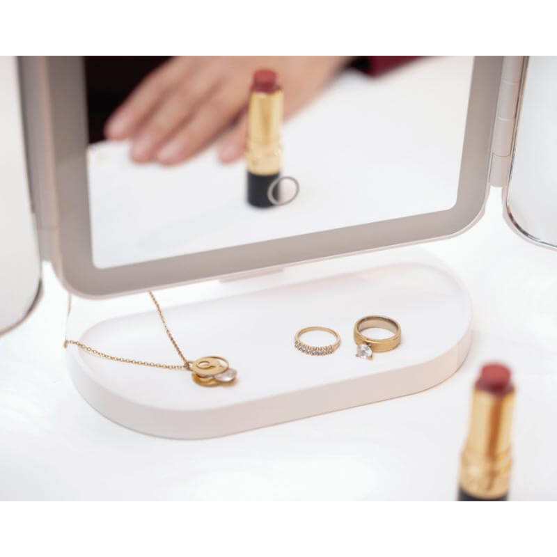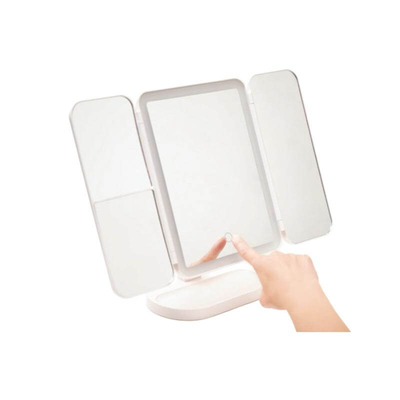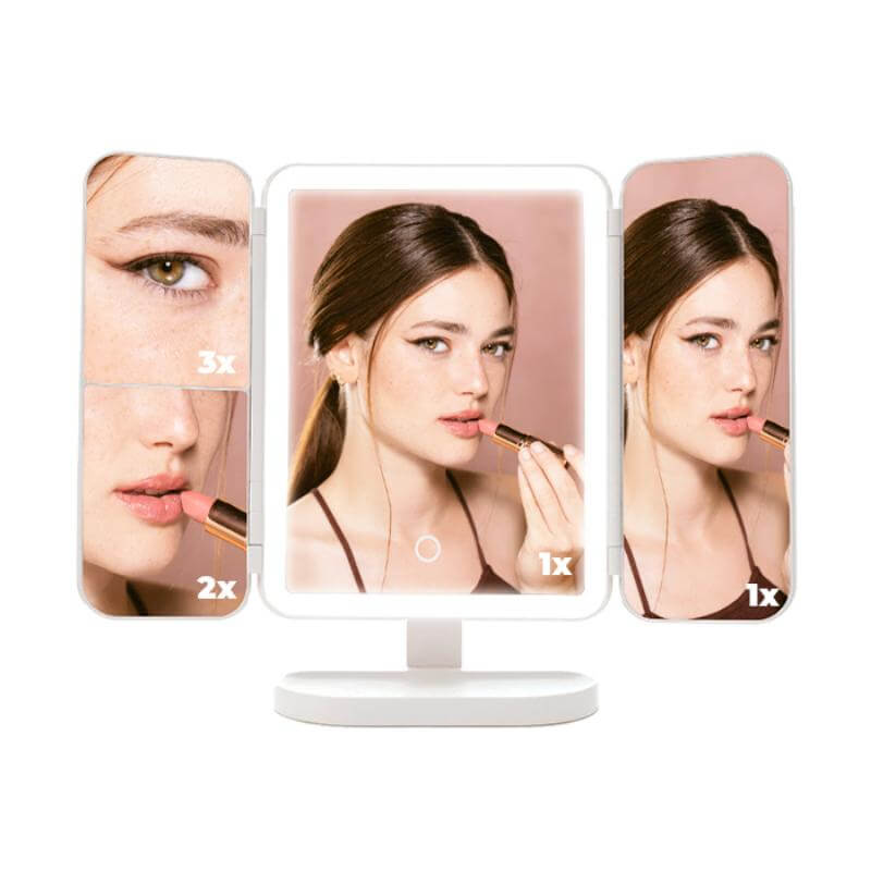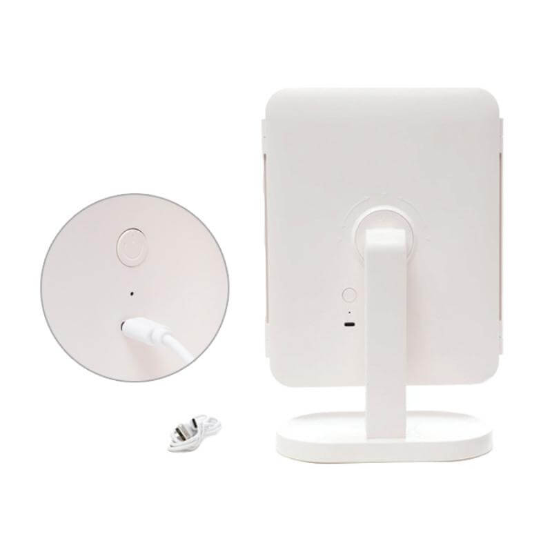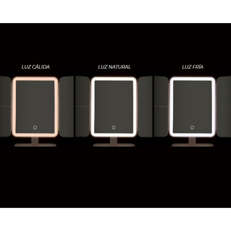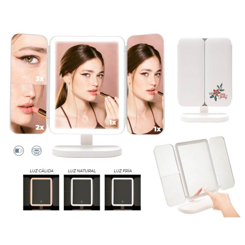 Espejo de luz LED plegable con base y 4 áreas de espejo independientes: el lado izquierdo cuenta con 2 espejos con lupa, 3X y 2X, el lado derecho y el espejo principal de 1X, mismo que tiene 70 luces LED alrededor. Cuenta con 3 tipos de luz: natural, fría y cálida con ajuste de intensidad de brillo. Se puede girar a la derecha o izquierda 180° y se puede inclinar hasta 90° (viendo hacia arriba). Cuenta con batería recargable con entrada tipo C. Tiempo de carga: 4 h, Tiempo de uso: 6 h con luz tenue y 3.5 h. con luz intensa. Accesorios: Cable USB tipo C. CAPACIDAD DE CARGA: 2500 mAh, Entrada: 5 V cc Salida: 5 V cc. Presentación: Caja de regalo a color.