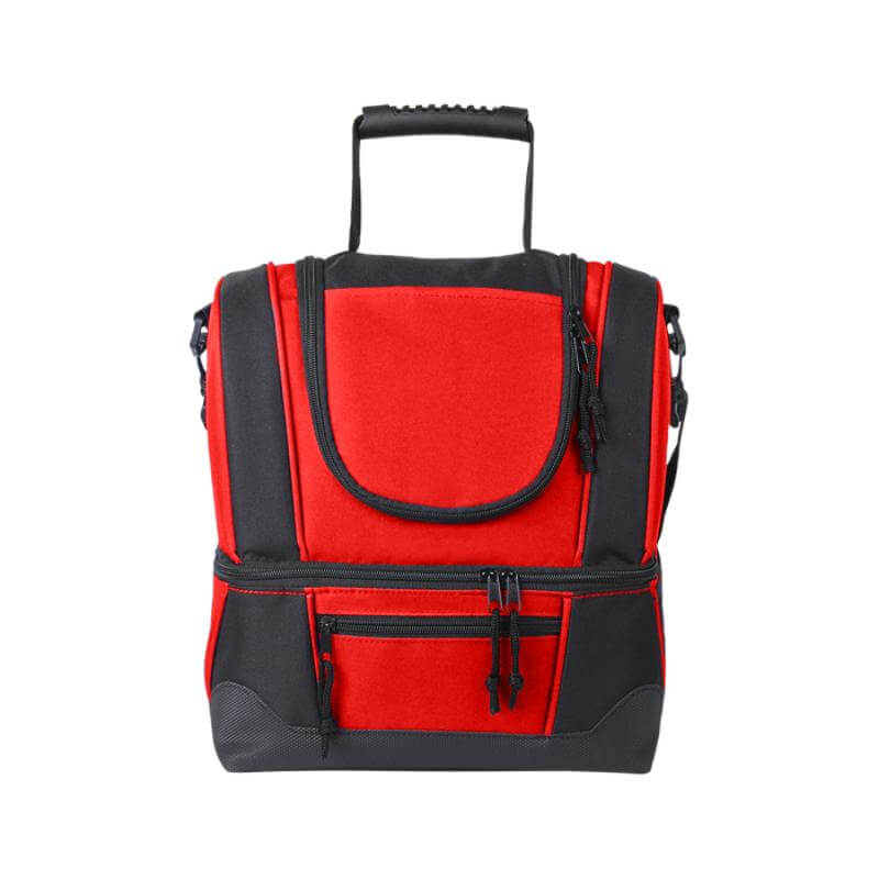 Lonchera / Hielera térmica con cubierta cosida e interior termosellado en plástico anti escurrimiento con 2 compartimentos: parte superior para alimentos y parte inferior para bebidas. Estos compartimentos cuentan con una red de separación con cierre, correa ajustable, bolsa lateral de malla, asa para transportar, 2 espacios para guardar; uno con cierre en la parte frontal y otro con broche en la parte superior e identificador transparente en la parte trasera. CAP. 8 latas.