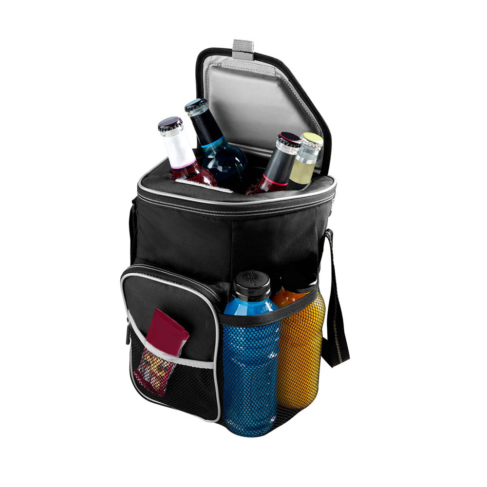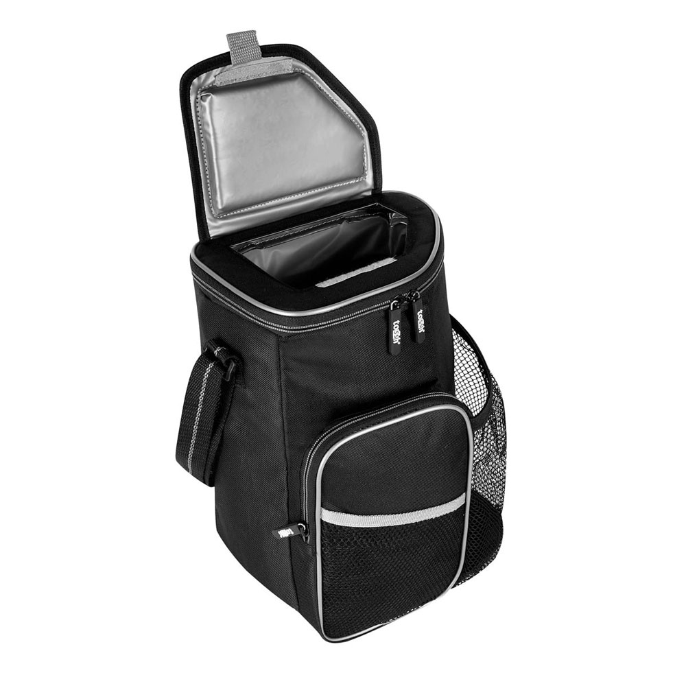 Interior plastificado impermeable. Bolsa frontal con cierre y bolsillo lateral y frontal de malla. Bolsa principal con cierre y ventana superior para fácil acceso al interior. Incluye correa ajustable. Capacidad para 6 latas.
