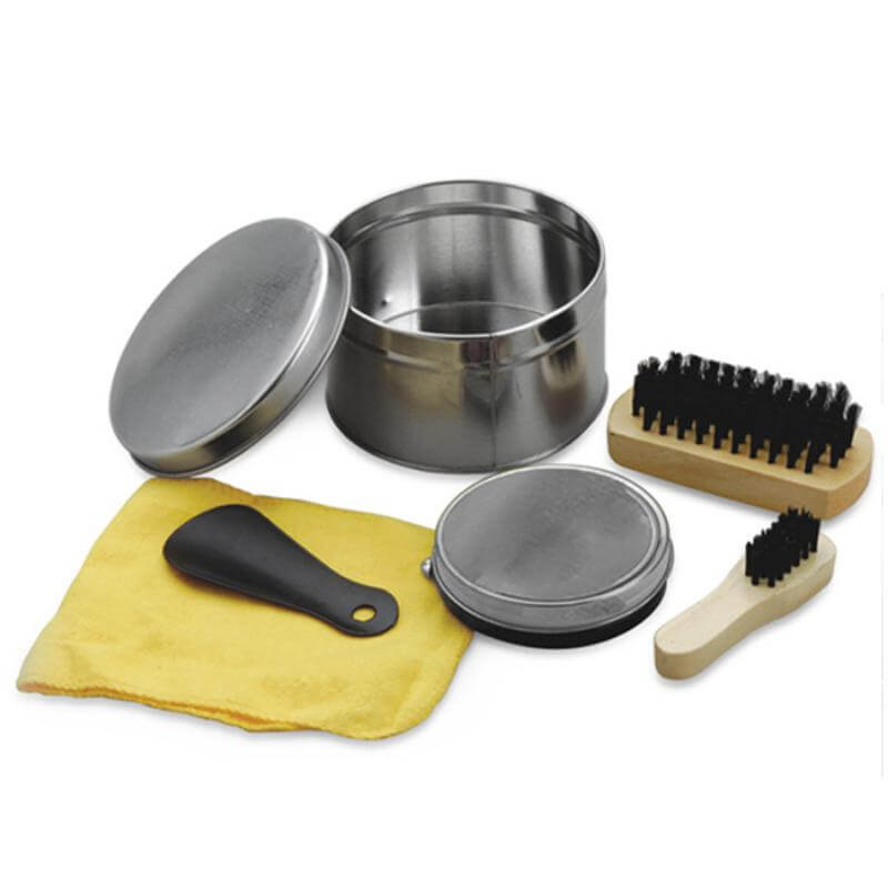 Juego de limpieza para calzado. Contenido: estuche metálico, 2 cepillos, calzador, paño y brillo para zapatos. Presentación: En caja.