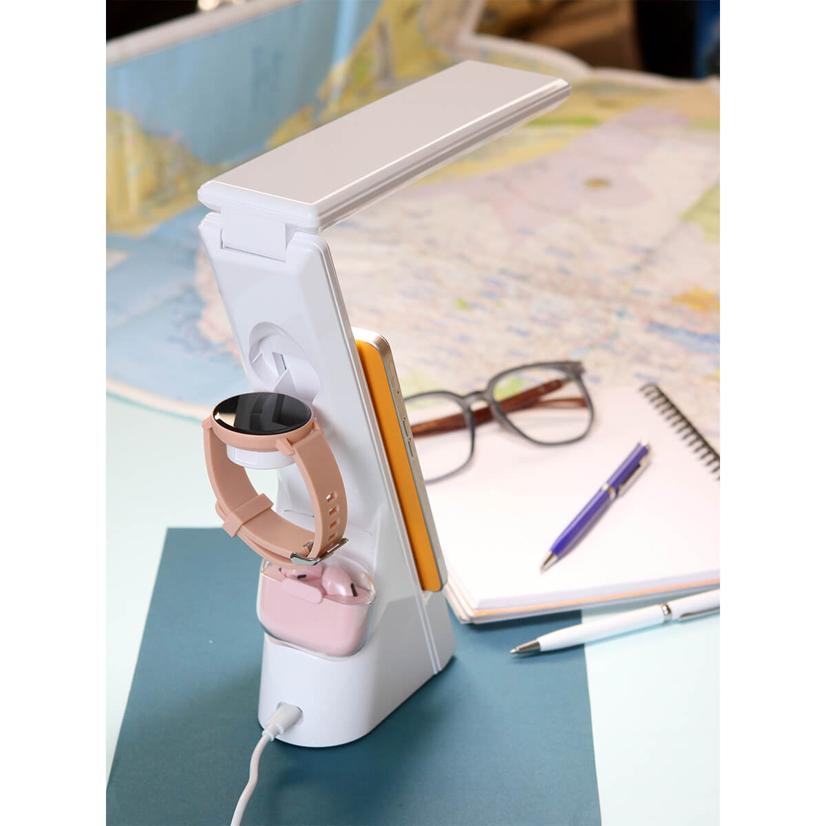 Lámpara LED de escritorio con cargador Inalámbrico. Fabricado en plástico ABS cuenta con 3 modos de iluminación, aumento o disminución de brillo, reloj, despertador y estación de carga inalámbrica para teléfonos móviles o audifonos compatibles con tecnología Qi. Simplemente coloque el teléfono en la plataforma de carga inalámbrica de la lámpara de escritorio y el teléfono se cargará automáticamente.Esta lampara es ideal para alumbrar tu hogar u oficina y cargar tu dispositivo al mismo tiempo.Incluye caja individual