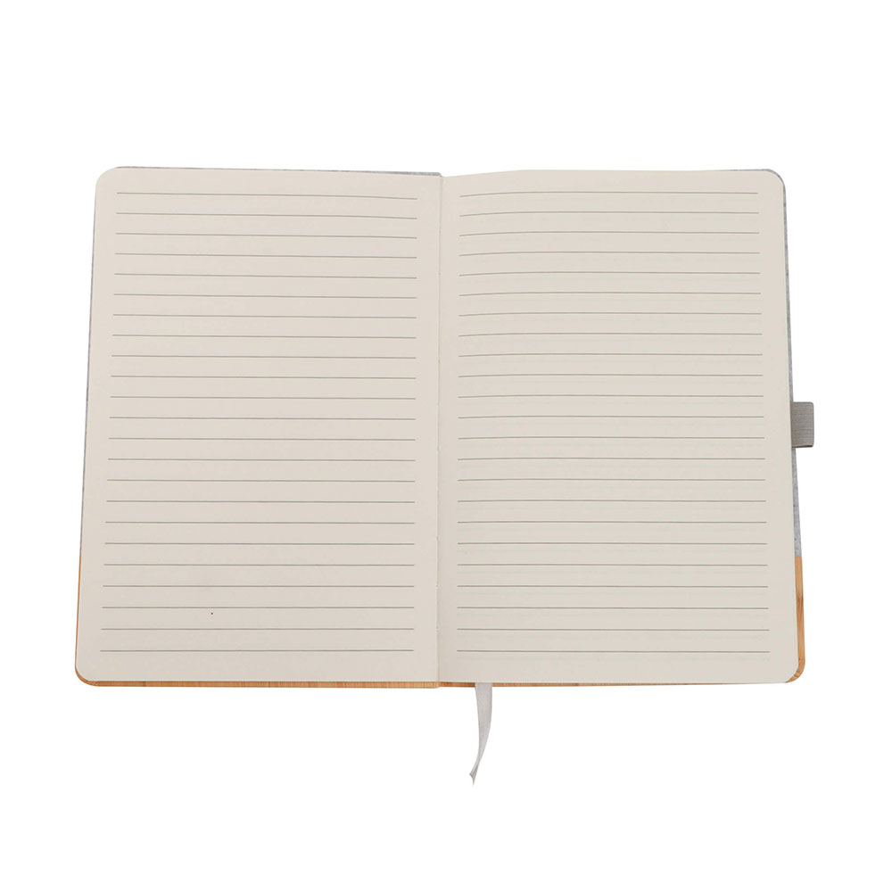 Libreta de poliuretano con simulación de madera y felpa, 82 hojas rayadas, separador y banda elástica.