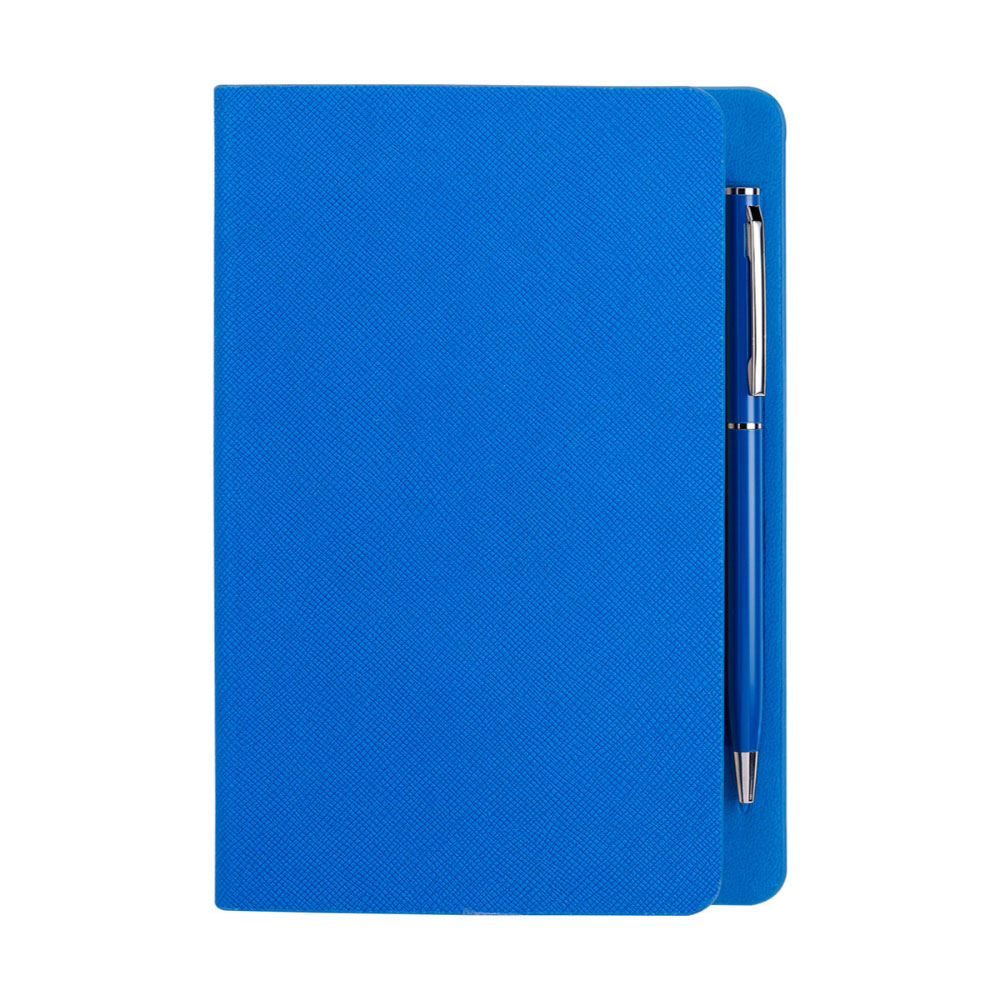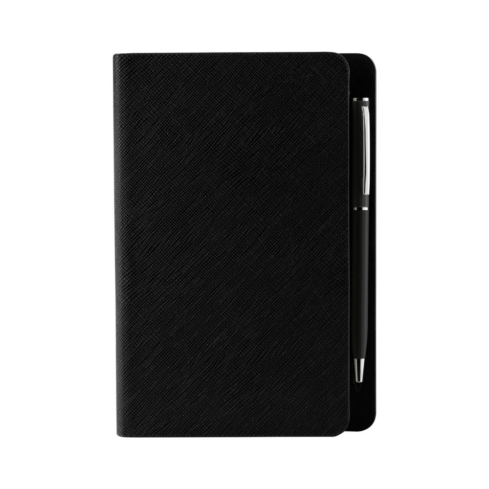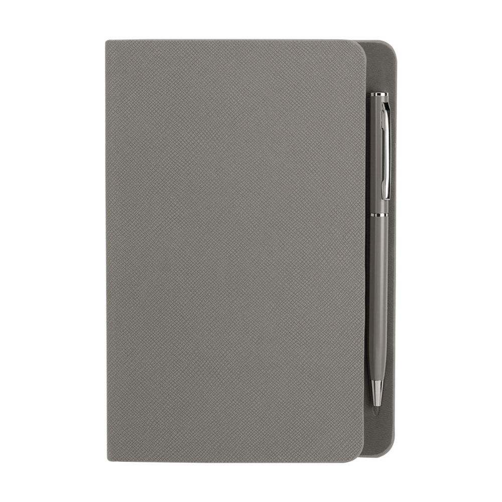 Libreta con 80 hojas de raya. Contracubierta con espacio imantado para Bolígrafo. Incluye Bolígrafo metálico.