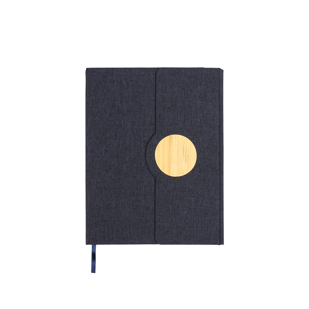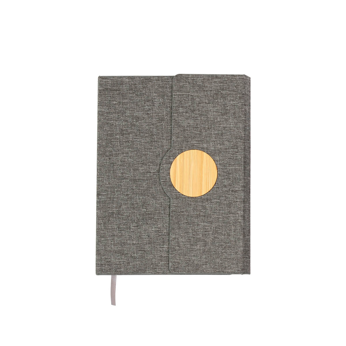 Libreta con cubierta dura fabricada en RPET, con cierre magnético y detalle de bambú. Tamaño A5, 80 hojas, 70 g. Hojas rayadas.
