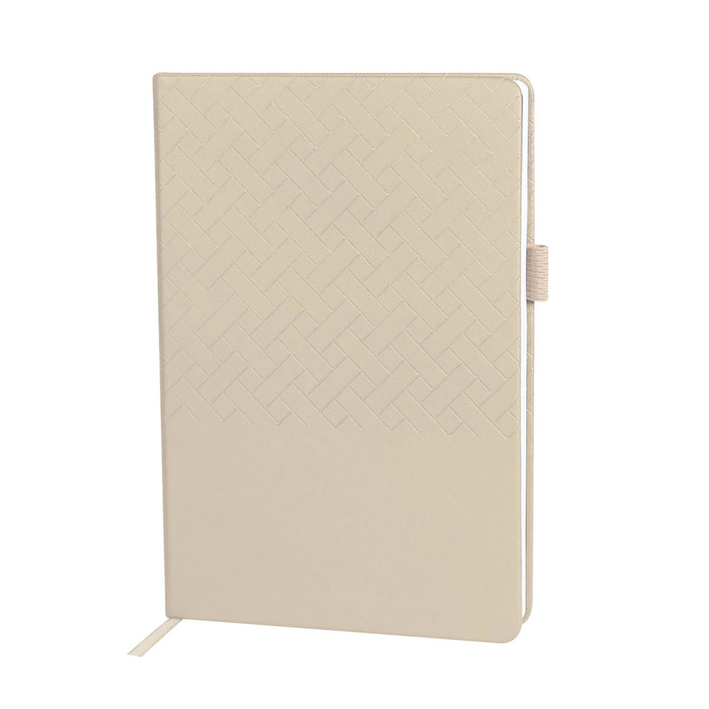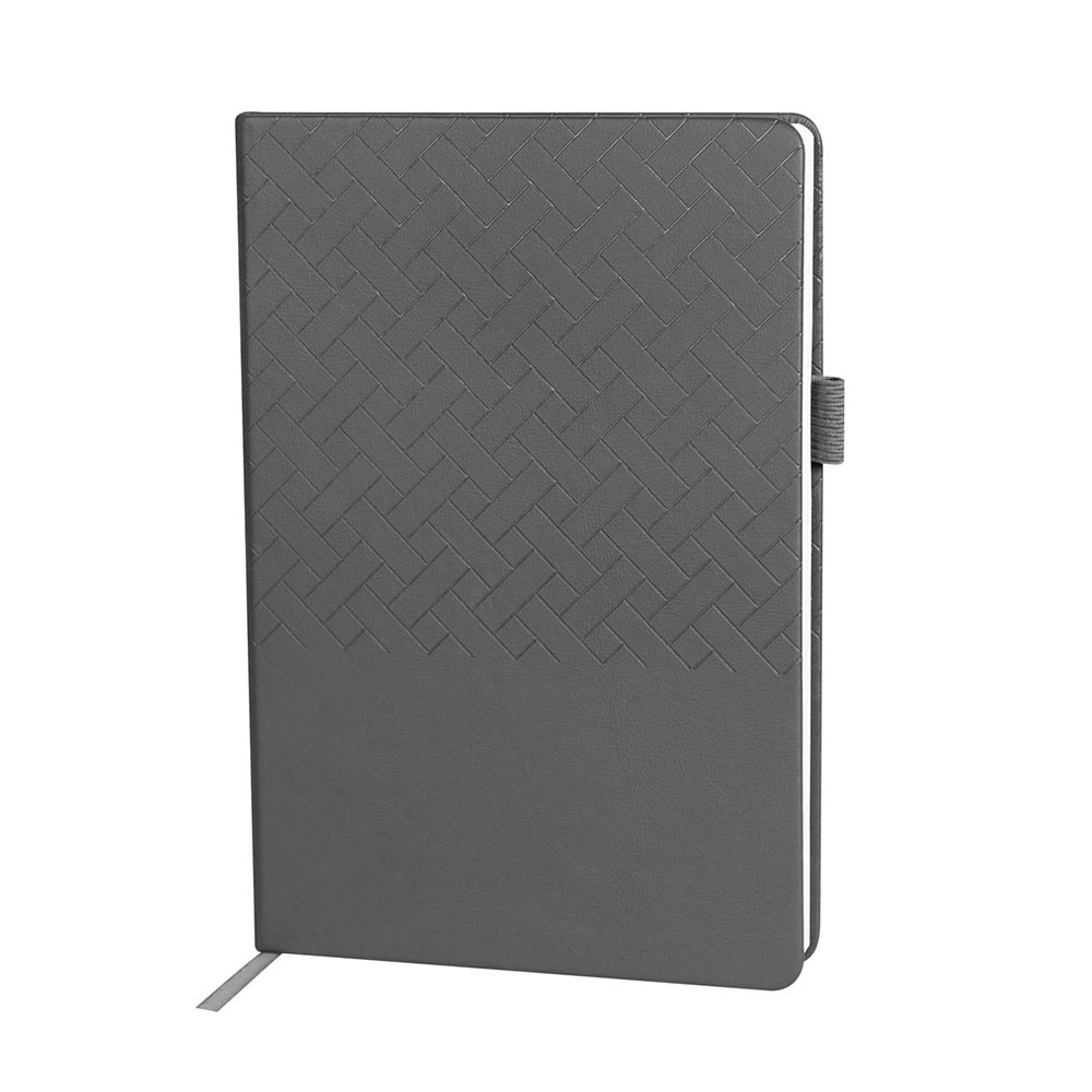 Libreta con 80 hojas a raya. Cubierta rígida. con dos tipos de textura: una con diseño en termograbado y otra lisa. Incluye elástico para Bolígrafo y separador de hojas. Bolígrafo no incluido.