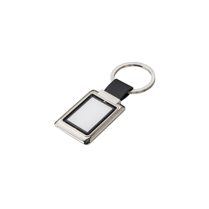 Llavero metálico de forma rectangular con centro de color, giratorio, cinta y arillo reforzado para colgar.