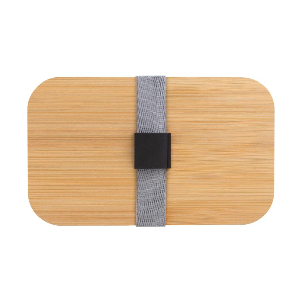 Contenedor de alimentos con tapa de Bambú. Posee un compartimento plástico y bandeja porta set de 3 cubiertos (cuchillo, tenedor y cuchara). La tapa de bambú debe presionar firmemente la bandeja donde se fija el juego de cubiertos. Cierre con sujeción elástica color gris y hebilla plástica color negro. Producto apto para microondas (sin la tapa). Importante: solo se puede calentar la comida, NO sirve para cocinarla. Bambú + PP. Capacidad 600 ml.