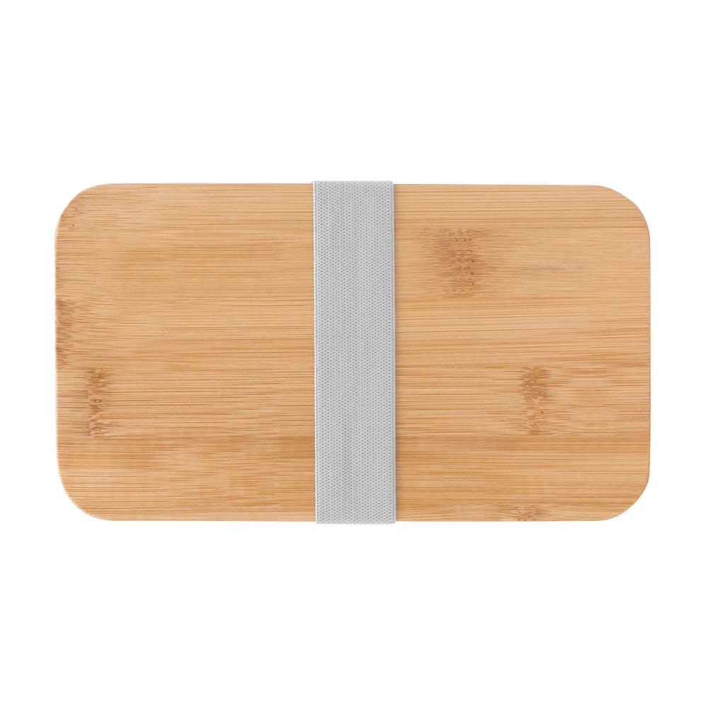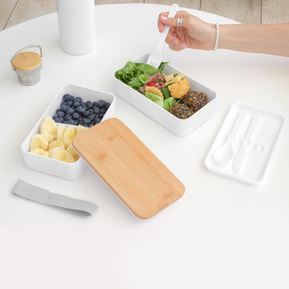 Contenedor de alimentos con tapa de Bambú. Posee dos compartimentos plásticos, un separador y bandeja porta set de 3 cubiertos (cuchillo, tenedor, cuchara). La tapa de bambú debe presionar firmemente la bandeja donde se fija el juego de cubiertos. Cierre con sujeción elástica color gris. Producto apto para microondas (sin la tapa). Importante: solo se puede calentar la comida, NO sirve para cocinarla. Bambú + PP.