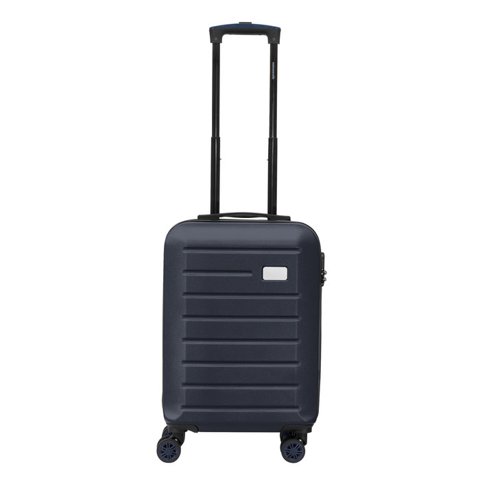 Maleta pequeña. 8 ruedas con giro 360°. Manija de transporte reforzada y engomada. Mango extensible hasta 48 cm. 2 posiciones. Interior: 2 compartimentos principales con cierre y elásticos ajustables. Placa metálica desmontable para grabado (medida: 5,3 x 3 cm.) Candado incluido con combinación donde se enganchan los cierres.