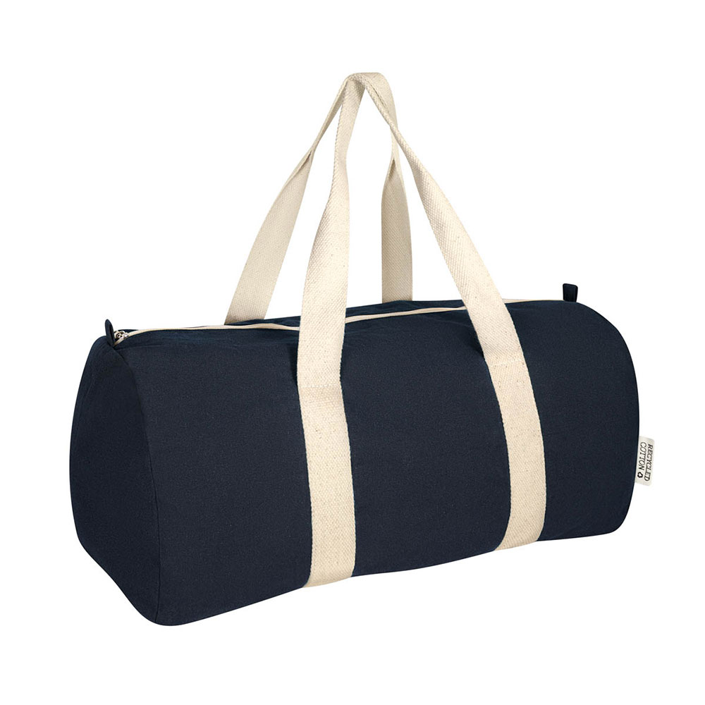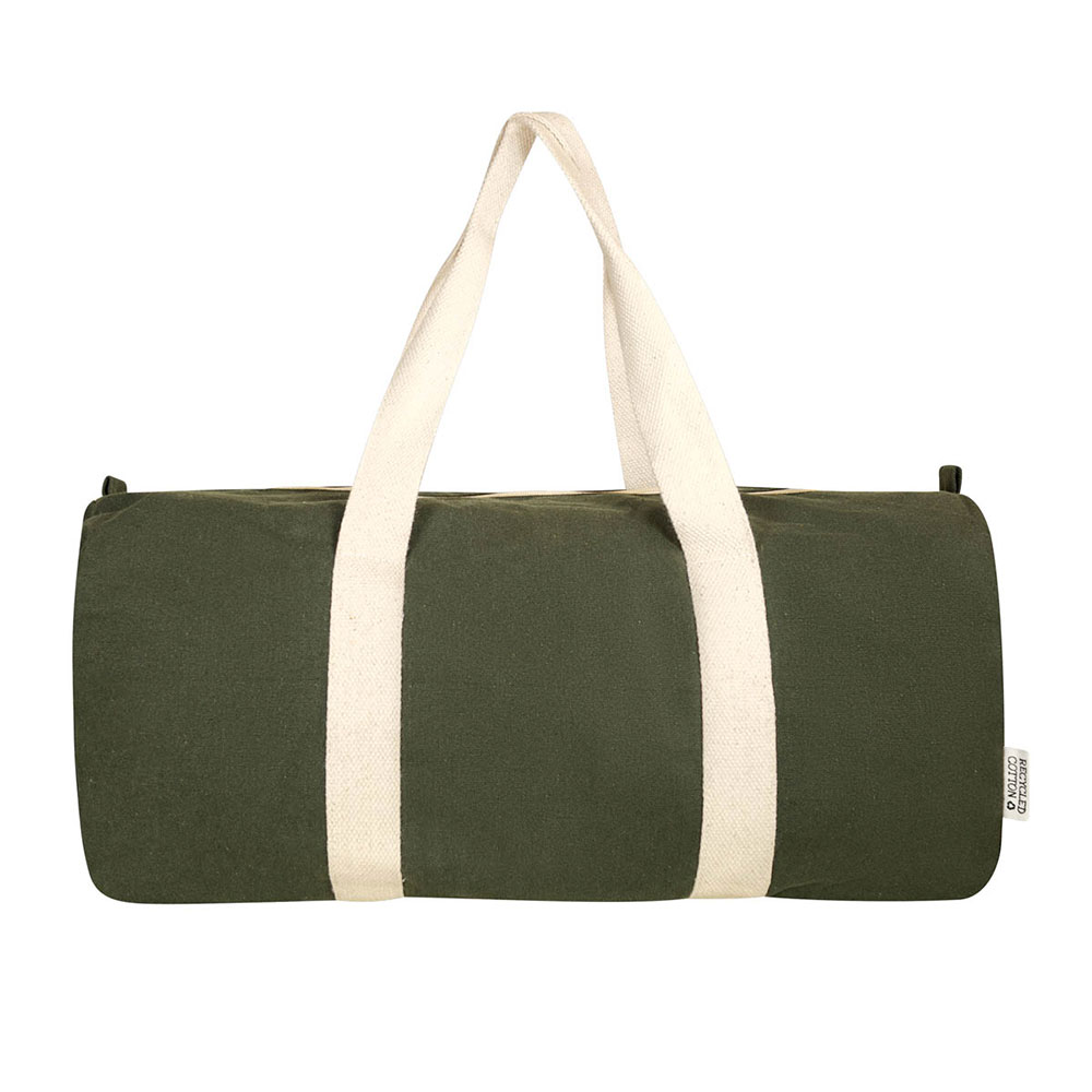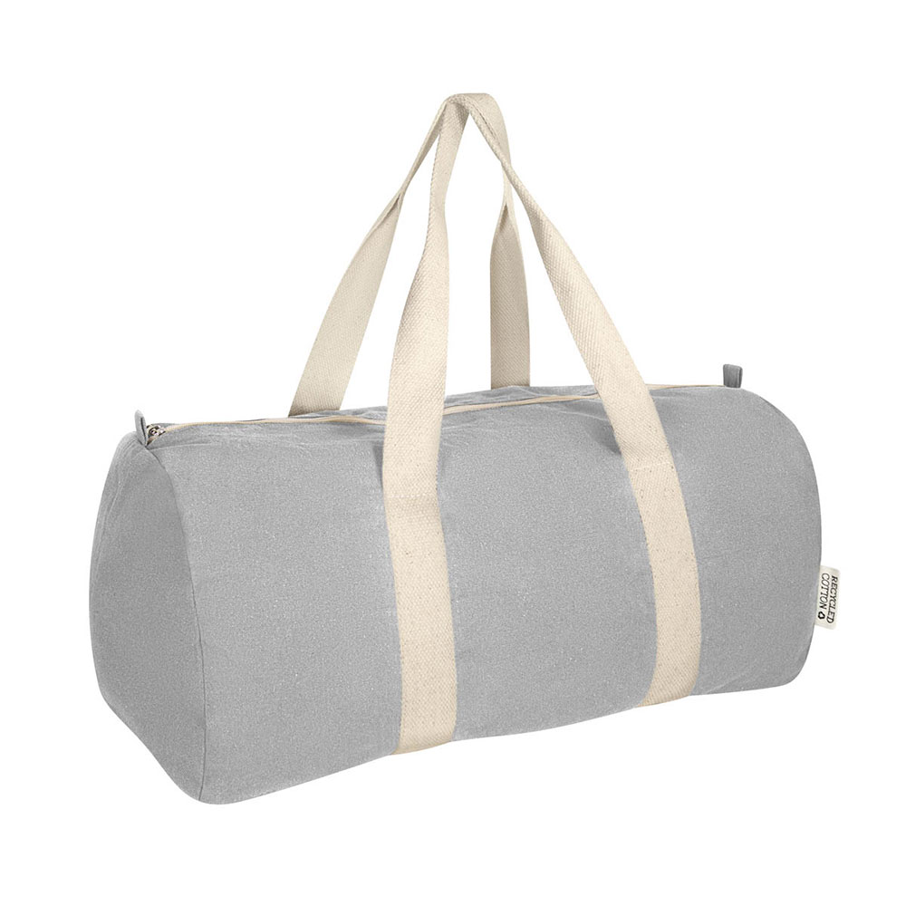 Maleta ecológica fabricada con algodón reciclado. Cuenta con un compartimento principal con cierre y dos asas para hombro.