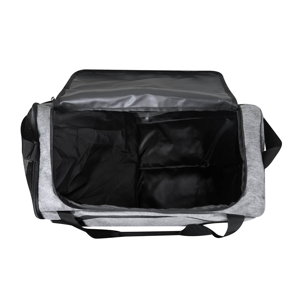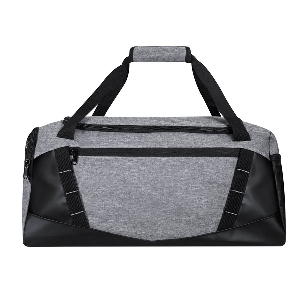 Maleta deportiva equipada con bolsa principal y una adicional en la parte frontal, ambas con cierre. Ademas, cuenta con un compartimento lateral para calzado y un bolsillo lateral de malla. Incluye correa ajustable para hombro y asas de agarre superior. Las costuras frontales permiten colgar objetos en ellas.