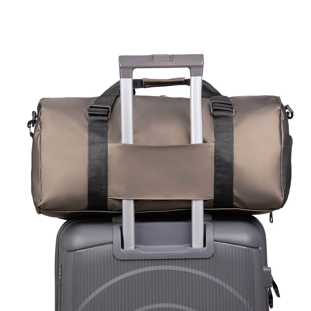 Maleta deportiva con compartimento principal con bolsillos internos, zapatera, banda para carry-on, asas con velcro y correa ajustable.